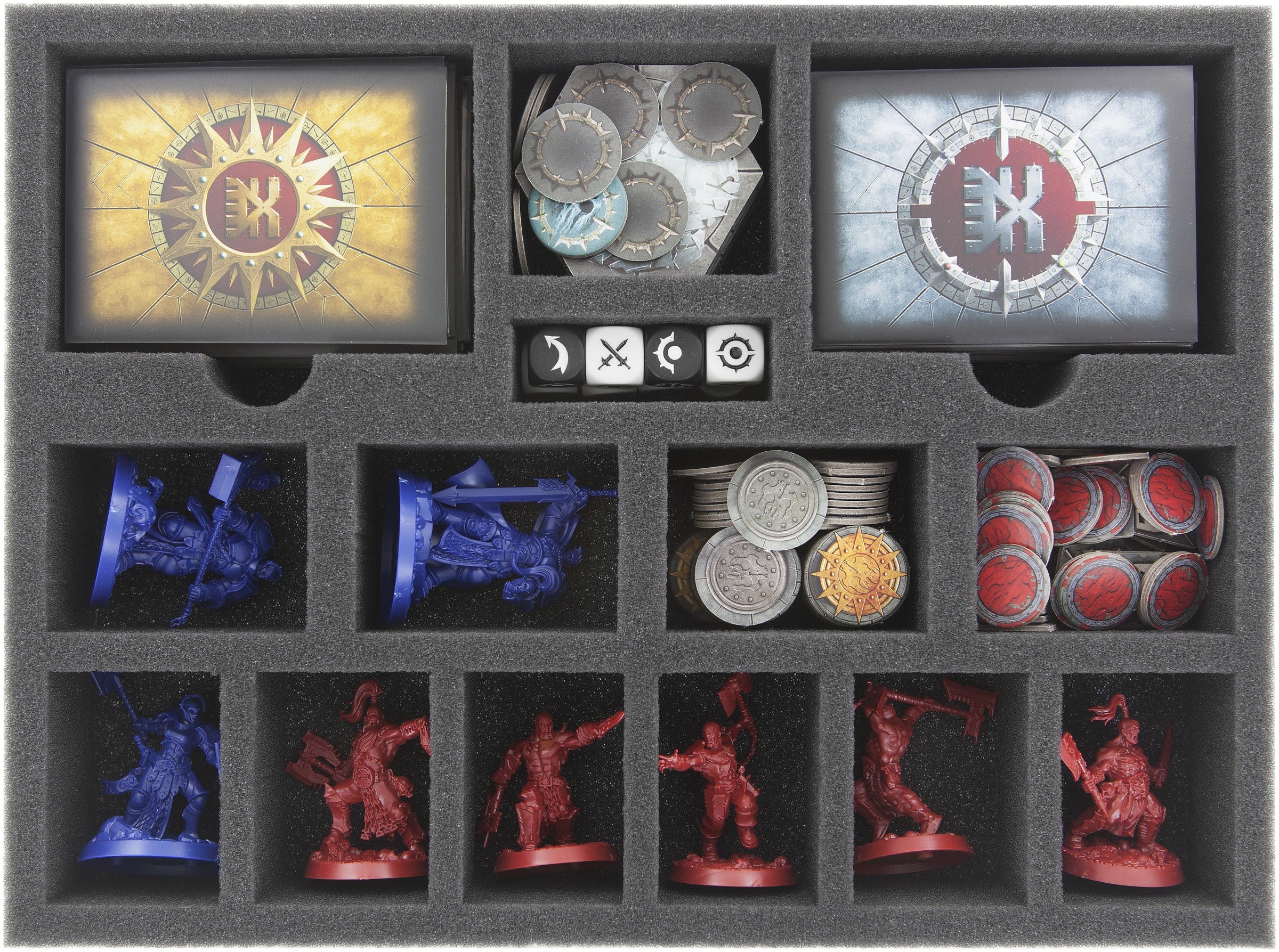 Die Einlage ist unterteilt in 14 exakt auf das Spielmaterial zugeschnittene Fächer. Acht von ihnen gewähren den drei Kriegern der Stormcast Eternals, sowie den fünf Khorne Bloodbound-Miniaturen einen sicheren Hort.