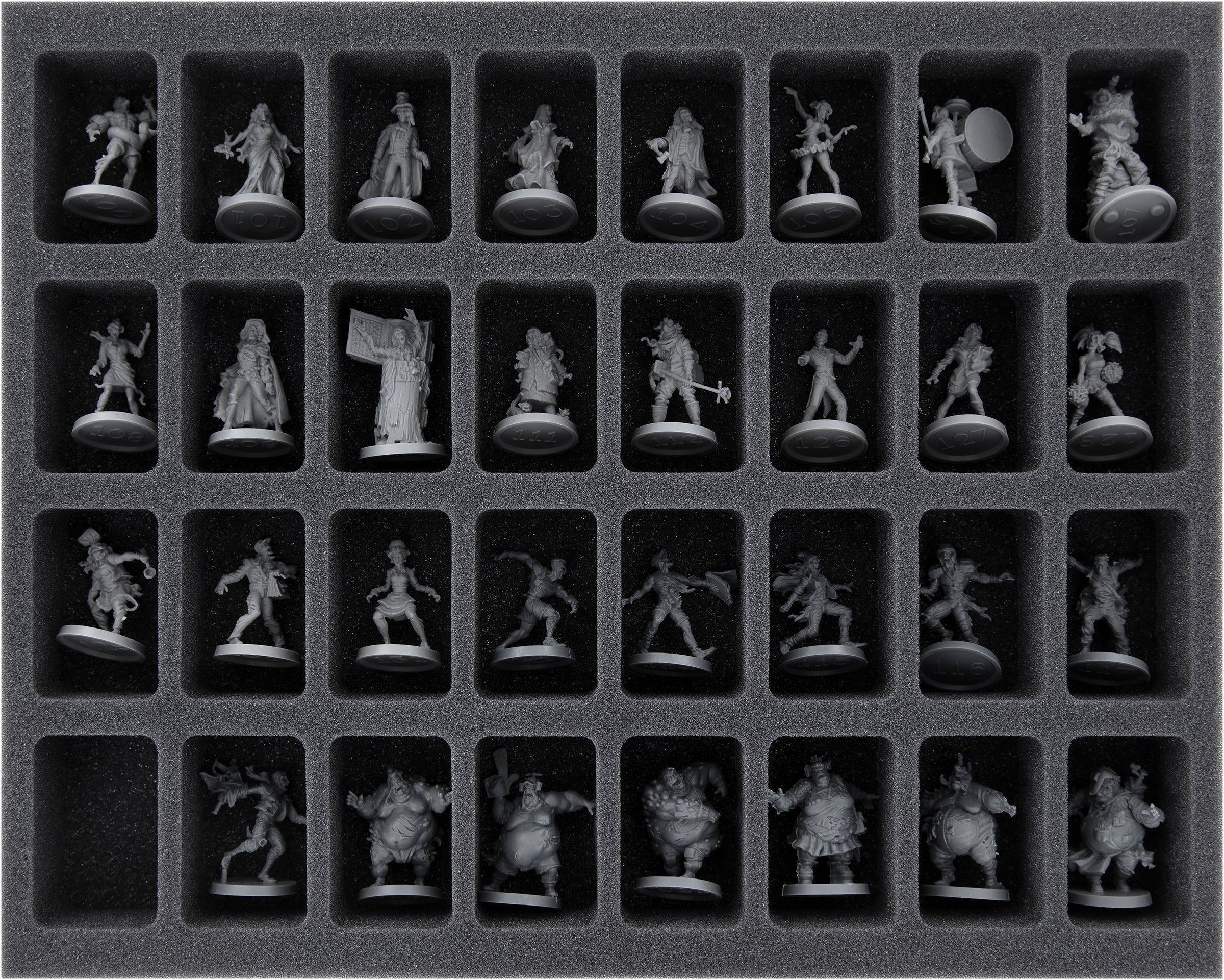 Egal ob du den Gitarre spielenden Zombie oder den Fanboy unter den Fettbrocken verstauen willst, jede der 31 Miniaturen bekommt ein passendes Fach. Selbst wenn der Transport über Stock und Gebein gehen sollte, dank des passgenauen Zuschnitts verrutschen die Miniaturen nicht und verbleiben an ihrem Platz.