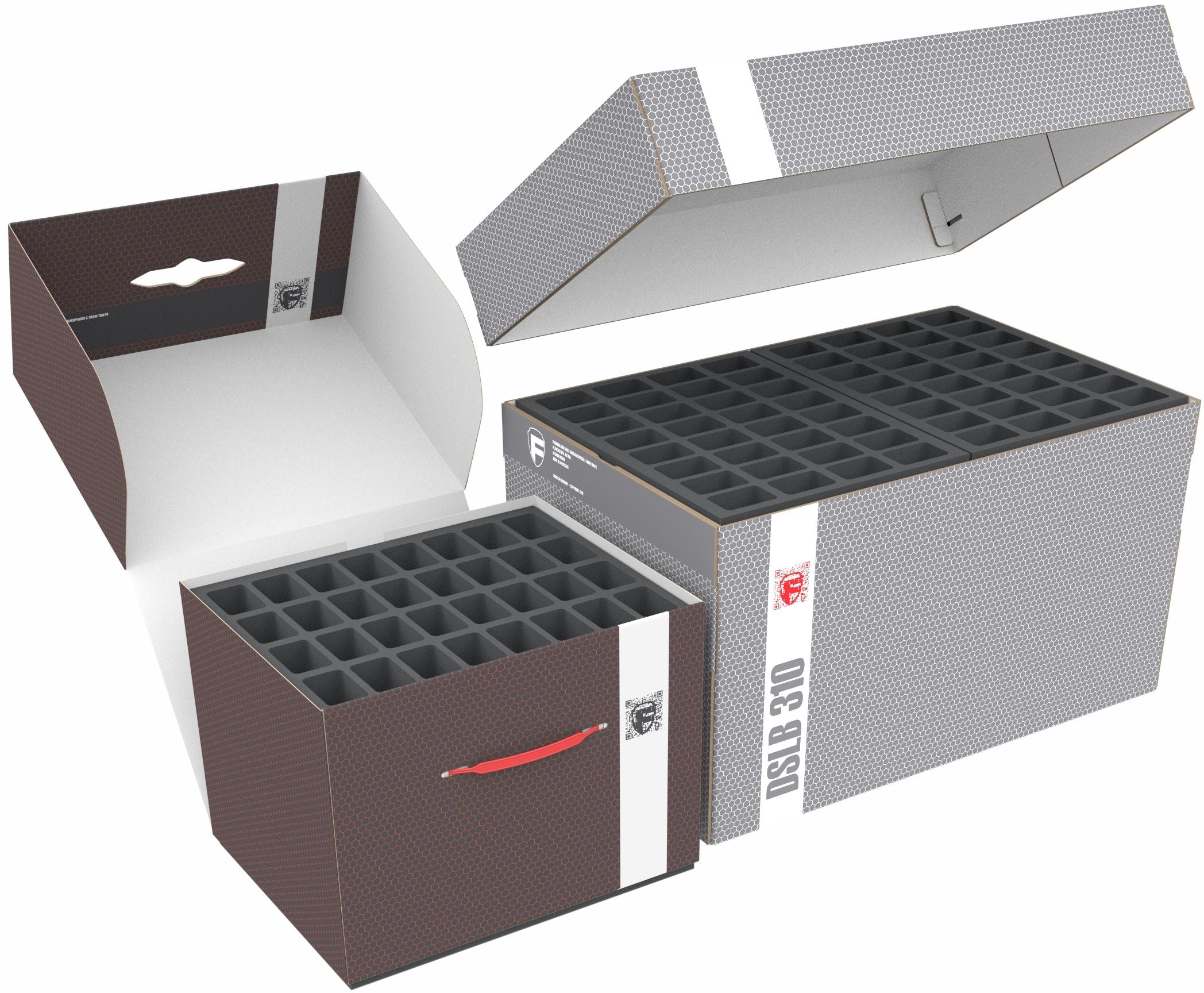 - Zwei stabile Lagerboxen (DSLB310 und FSLB250) gefüllt mit individuell passenden Schaumstoffeinlagen für Miniaturen und Spielmaterial