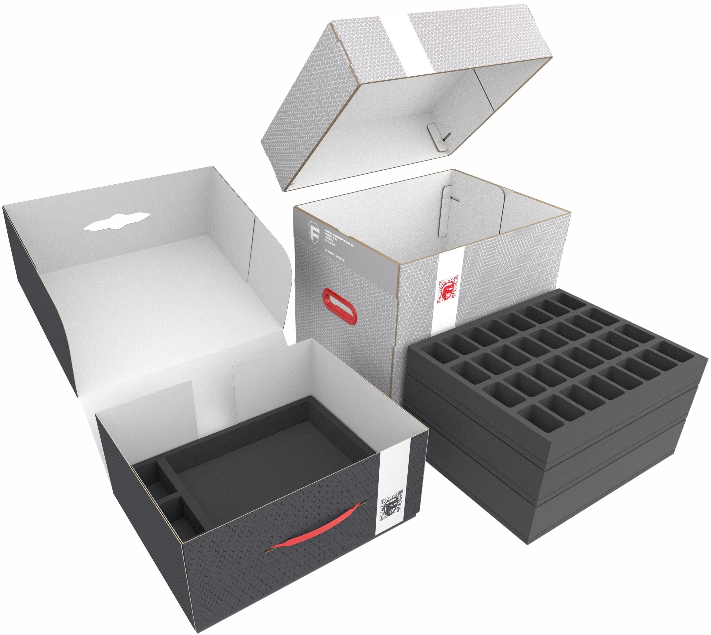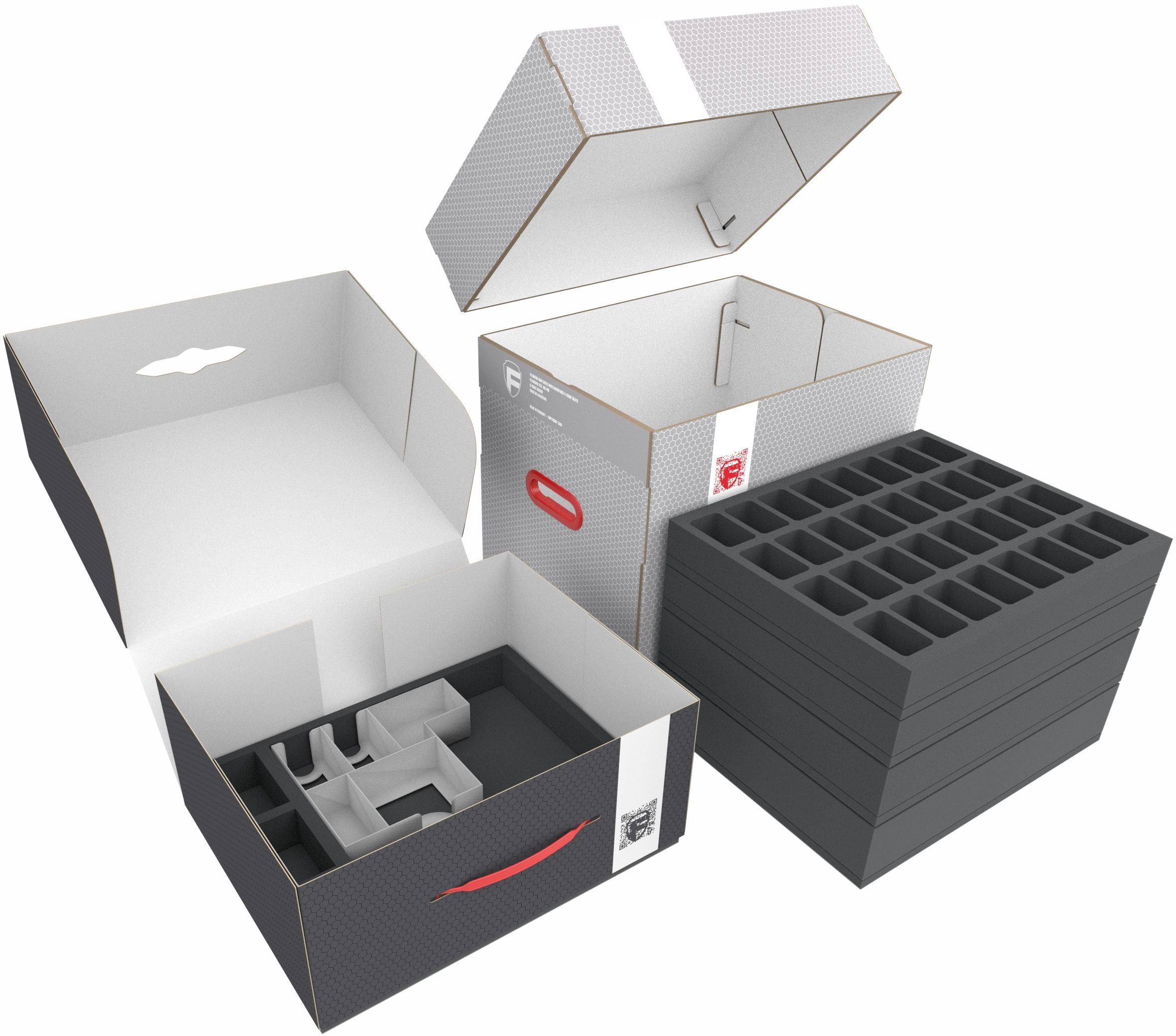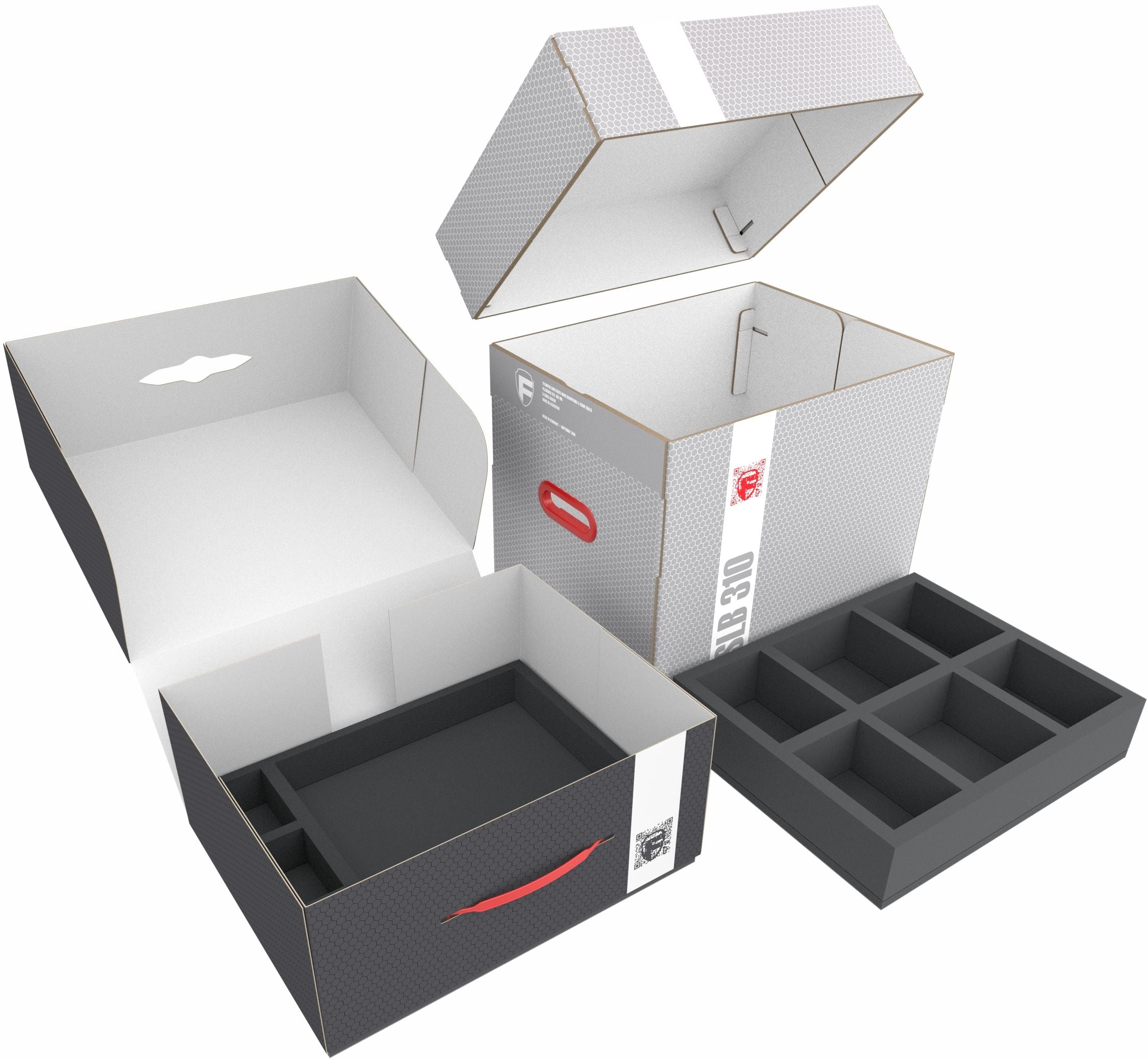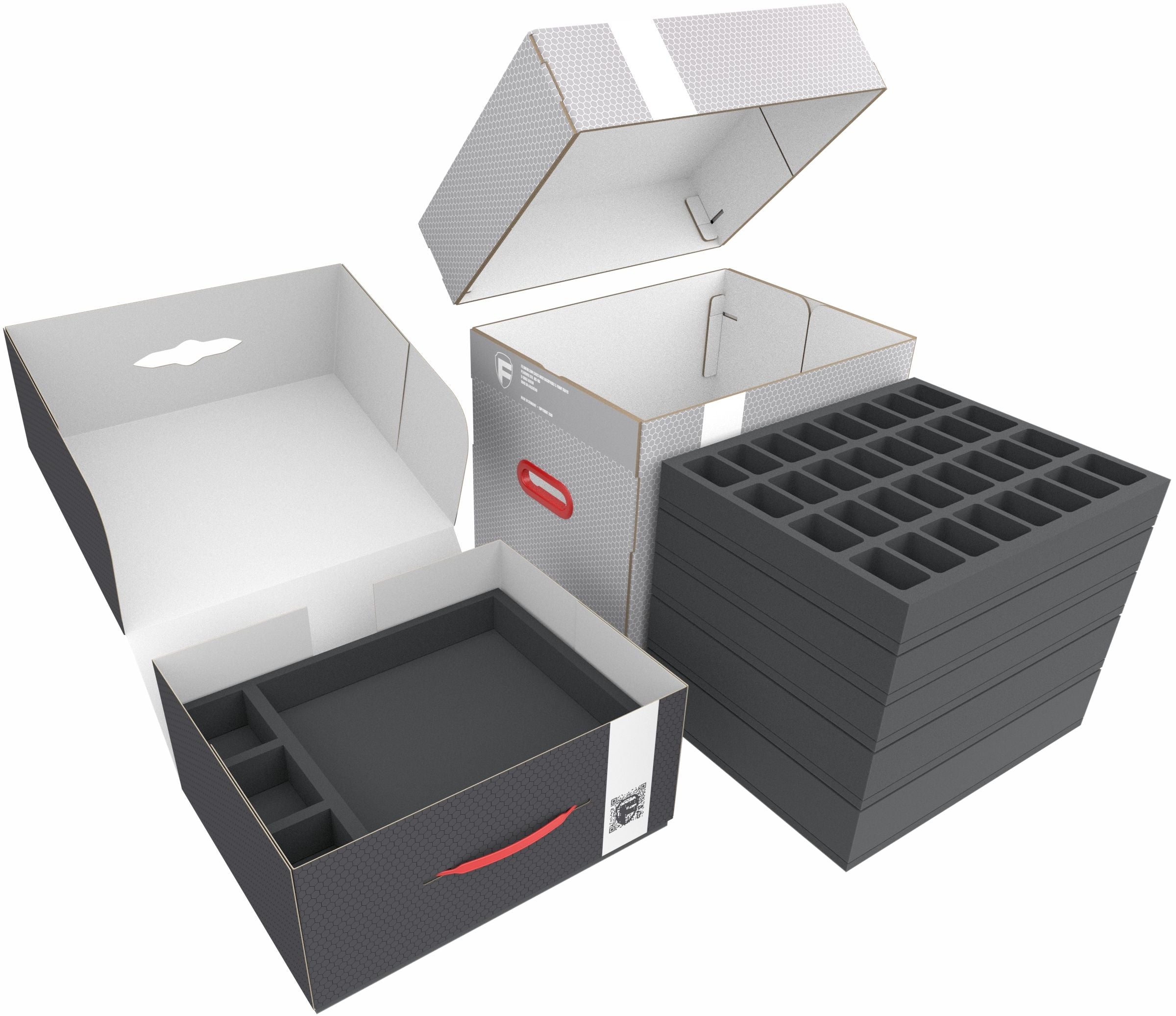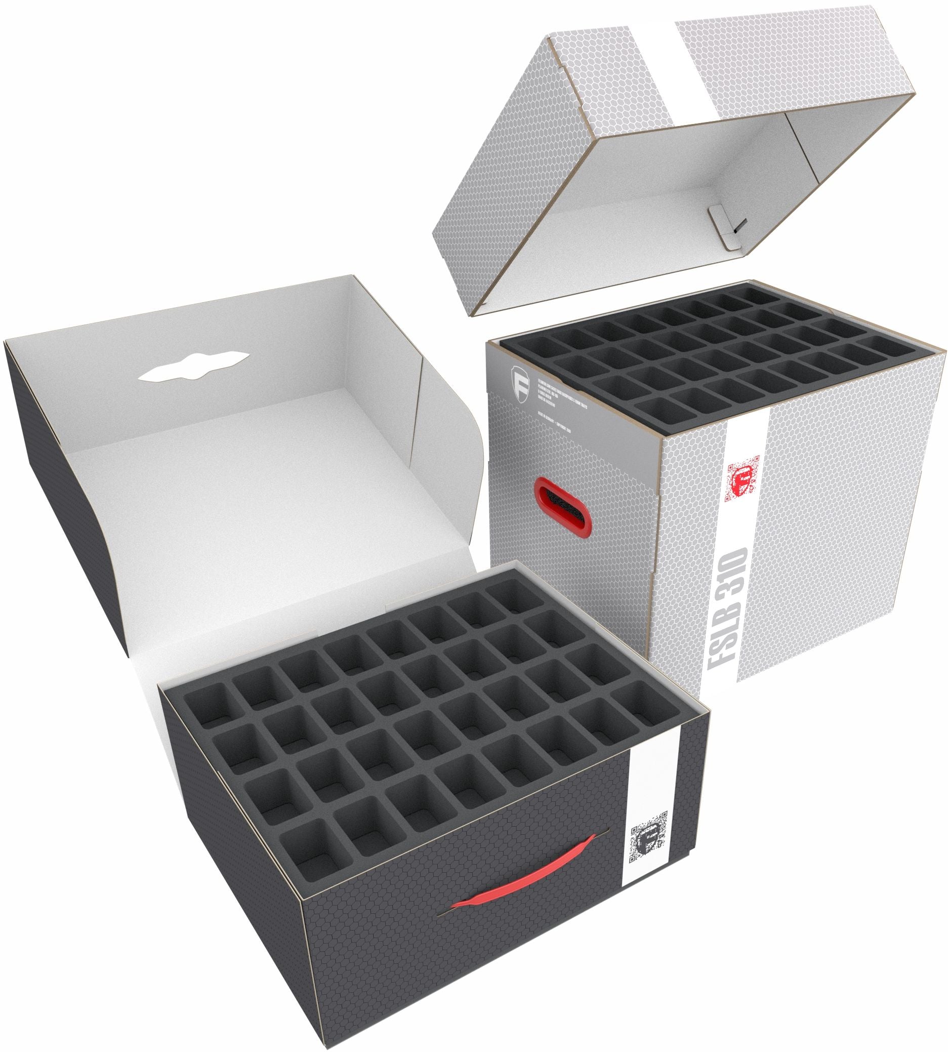 - Zwei stabile Lagerboxen (FSLB310 und FSLB150) gefüllt mit individuell passenden Schaumstoffeinlagen für Miniaturen und Spielmaterial