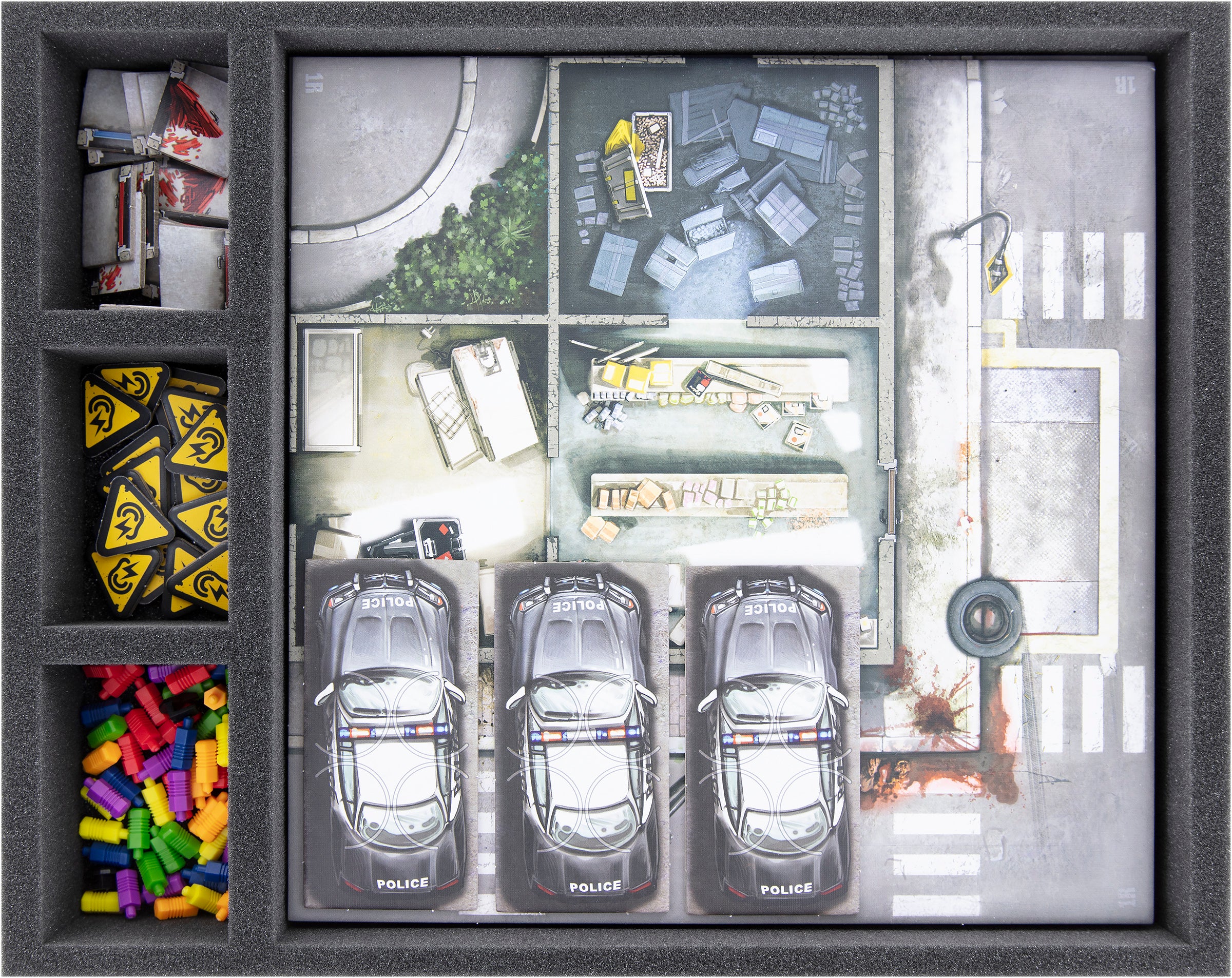 Individuelle Einlagen mit Fächern für Karten, Würfeln, Tiles und Token helfen dir dabei, beim Spielmaterial jederzeit die Übersicht zu behalten. Dank der mitgelieferten Kartenhalter lassen sich auch die kleinformatigen Karten übersichtlich einsortieren. Für die Dashboards und weiteres Spielmaterial ist ein Rasterschaumstoff mit Schaumstoffboden enthalten. Dank des Rasters kannst du die Fächer individuell nach deinen Vorstellungen gestalten und befüllen. So hast du dein Spielmaterial stets schnell zur Hand. Die Zeit und Nerven, die du für den Spielaufbau sparst, kannst du stattdessen in die Zombiehatz investieren.