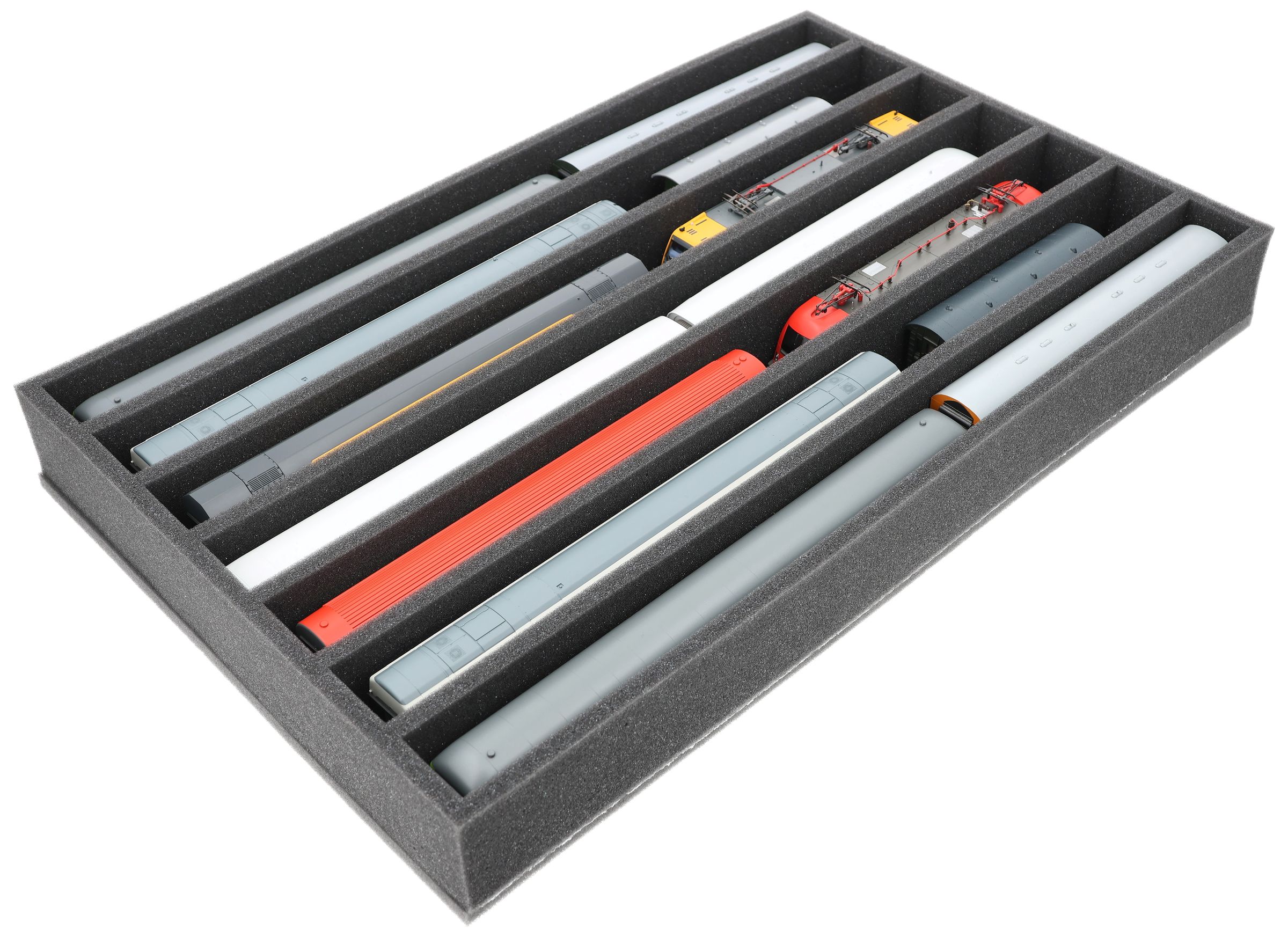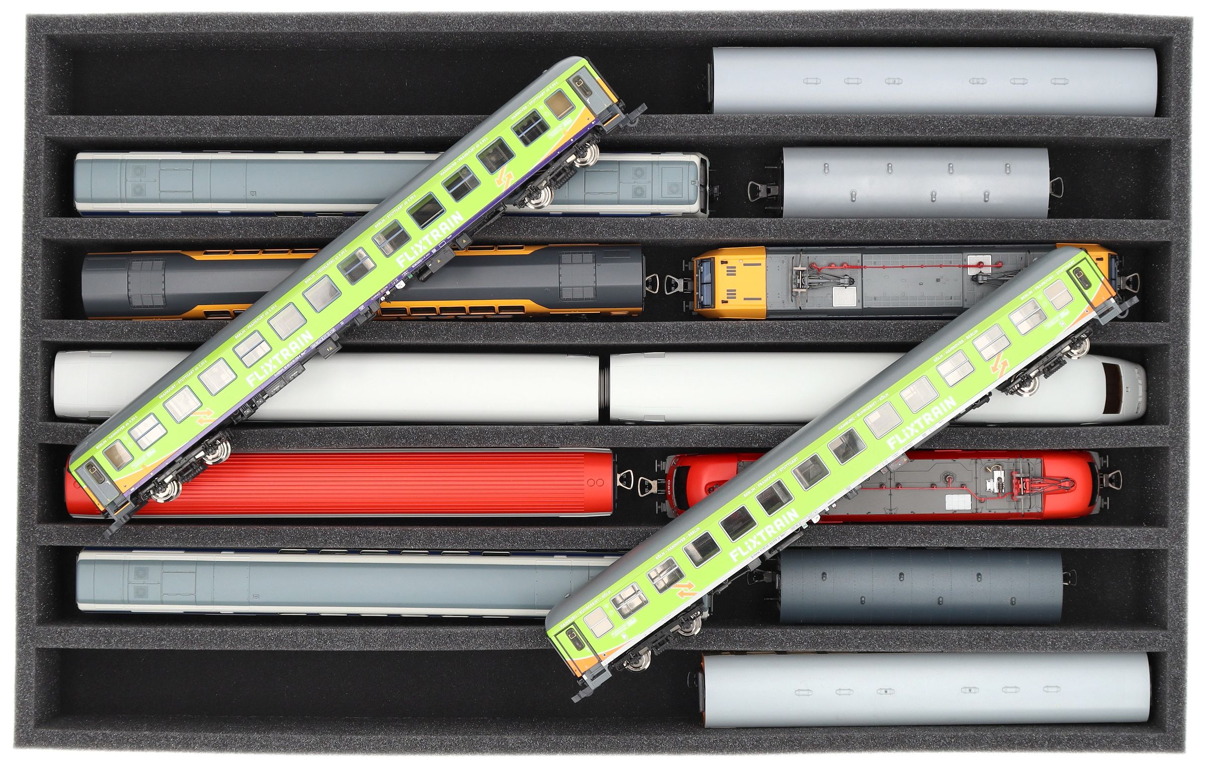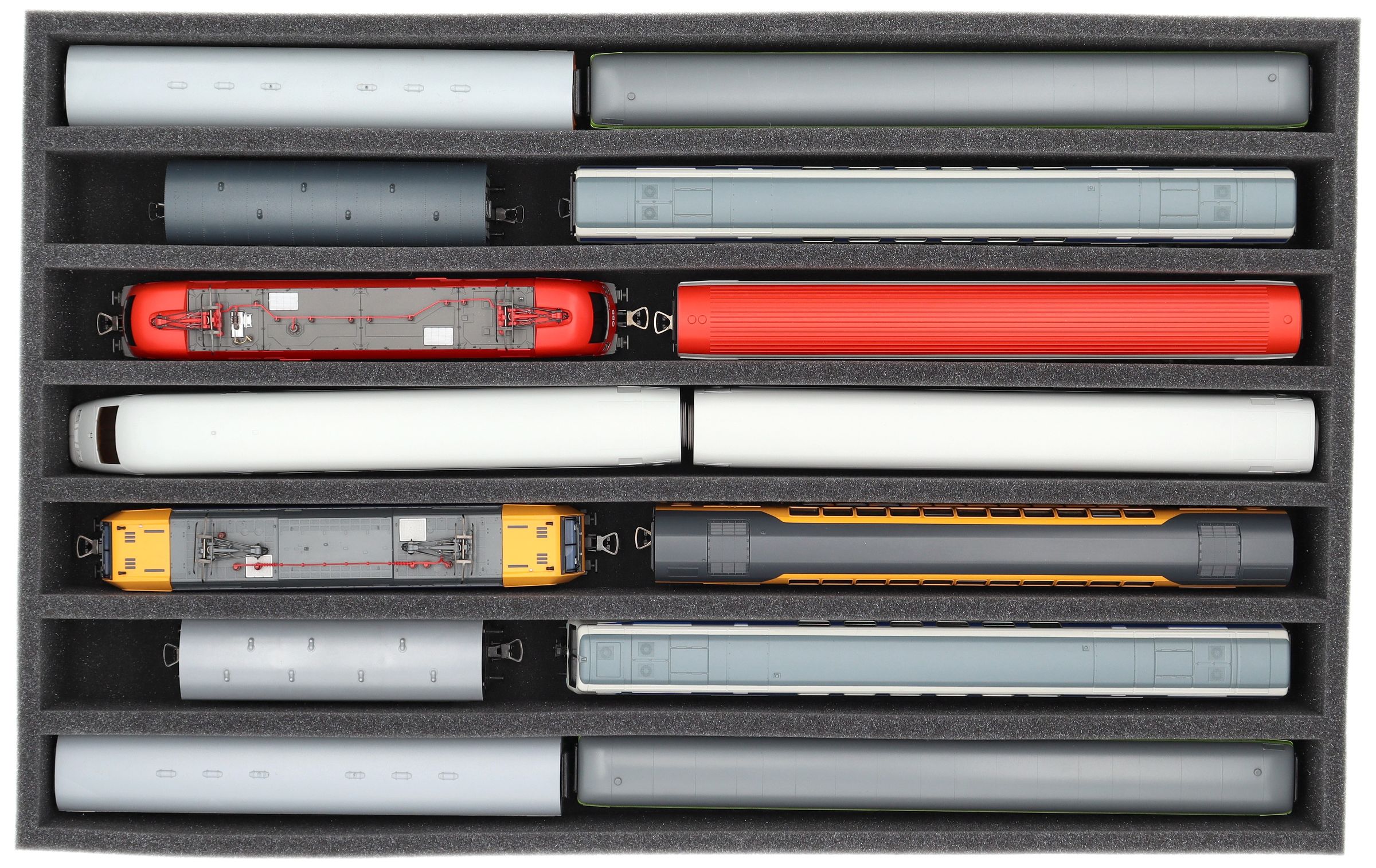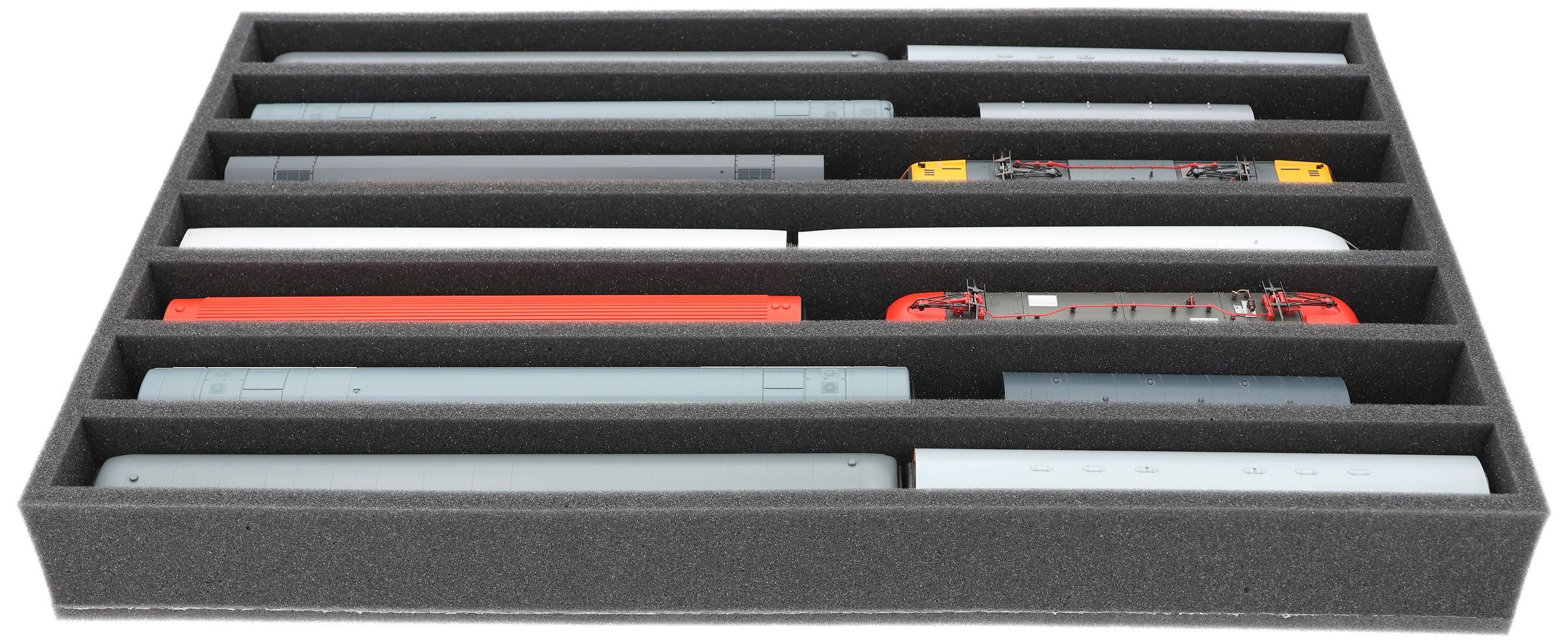 Mehrere Züge und Wagen können nebeneinander in einem Fach untergebracht werden. Um ein Aneinanderstoßen oder ungewolltes Ankuppeln zu verhindern, bieten wir passende Schaumstoff-Distanzstücke (HS040A002, HS020A001) an.