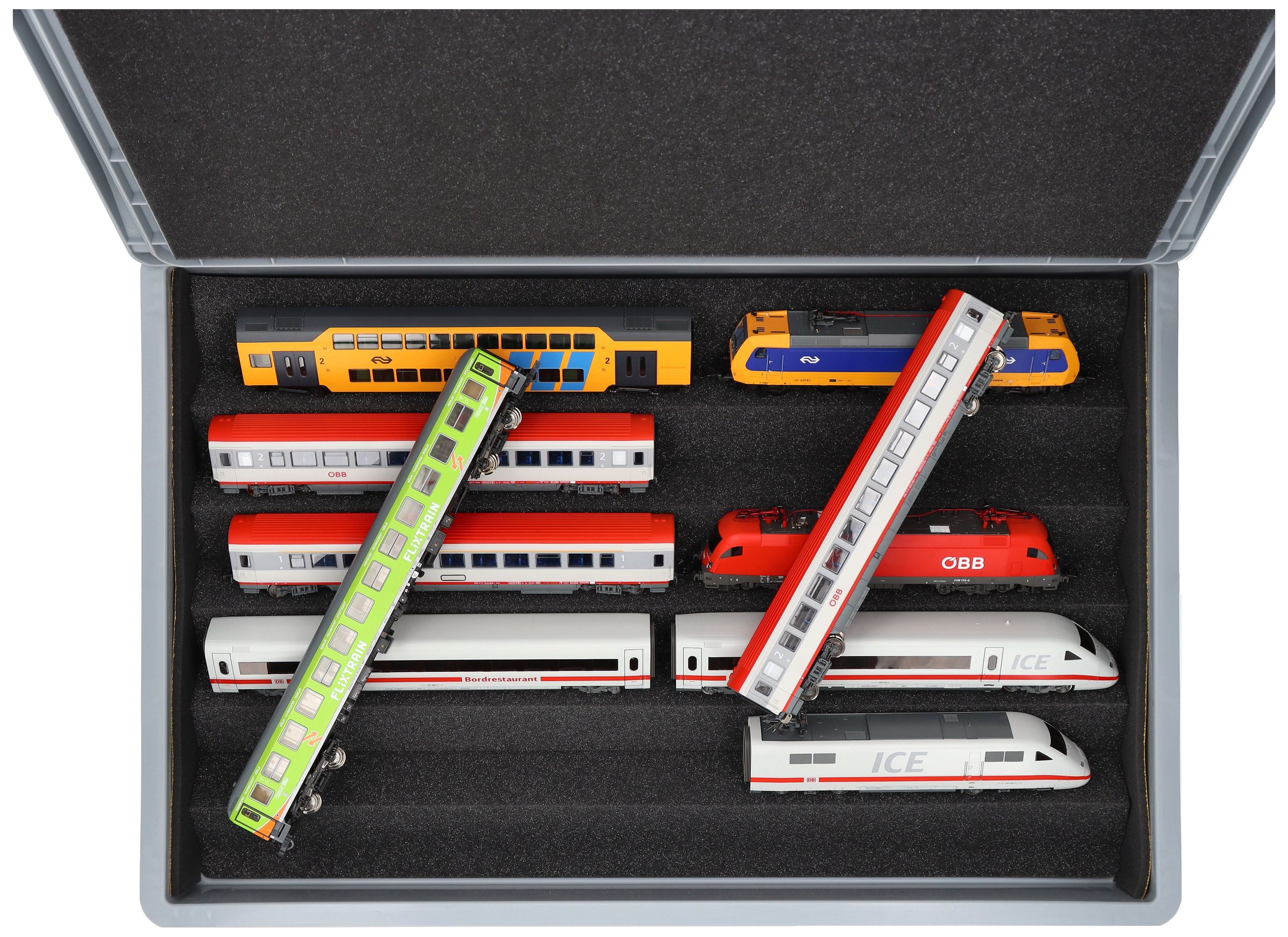 Ordentlich aufbewahrt, anschaulich präsentiert und sicher transportiert – Die flexible Schaumstoffeinlage für Modelleisenbahnen in Spur H0 in der stabilen Eurobox.