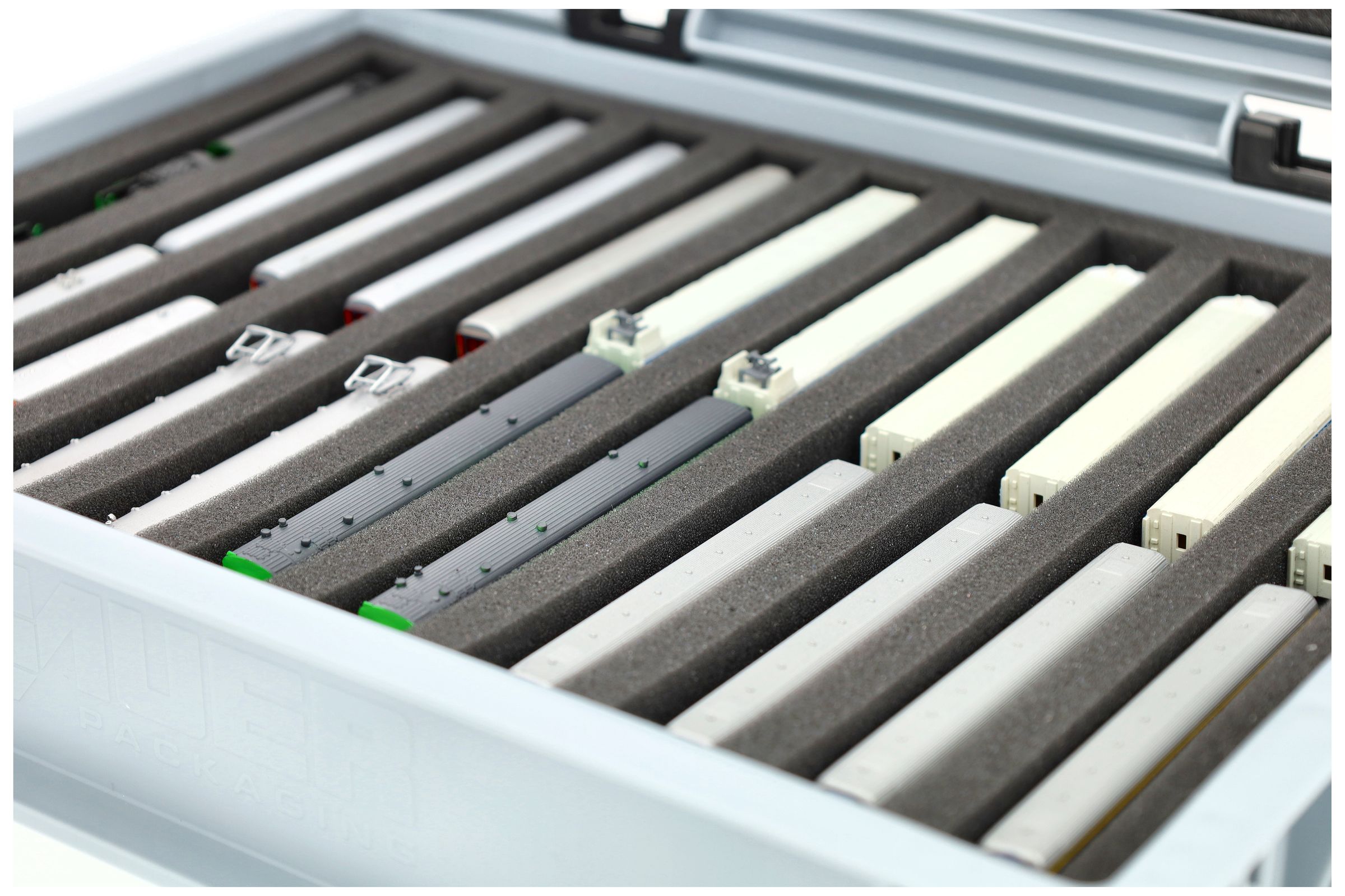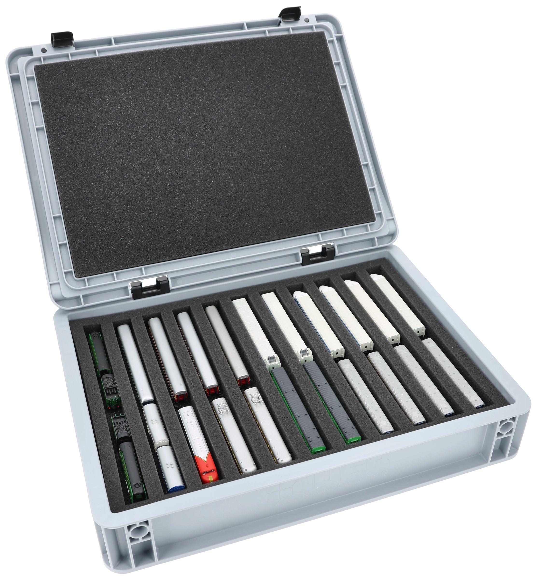 Die 11 gleich großen Fächer (je ca. 245 x 20 x 20 mm) sind speziell für Modelle der Spur Z ausgelegt. Je nach Länge passen mehrere Waggons oder Lokomotiven nebeneinander. Die exakte Passform sorgt dafür, dass die Modelle sicher fixiert sind und beim Transport nicht verrutschen.