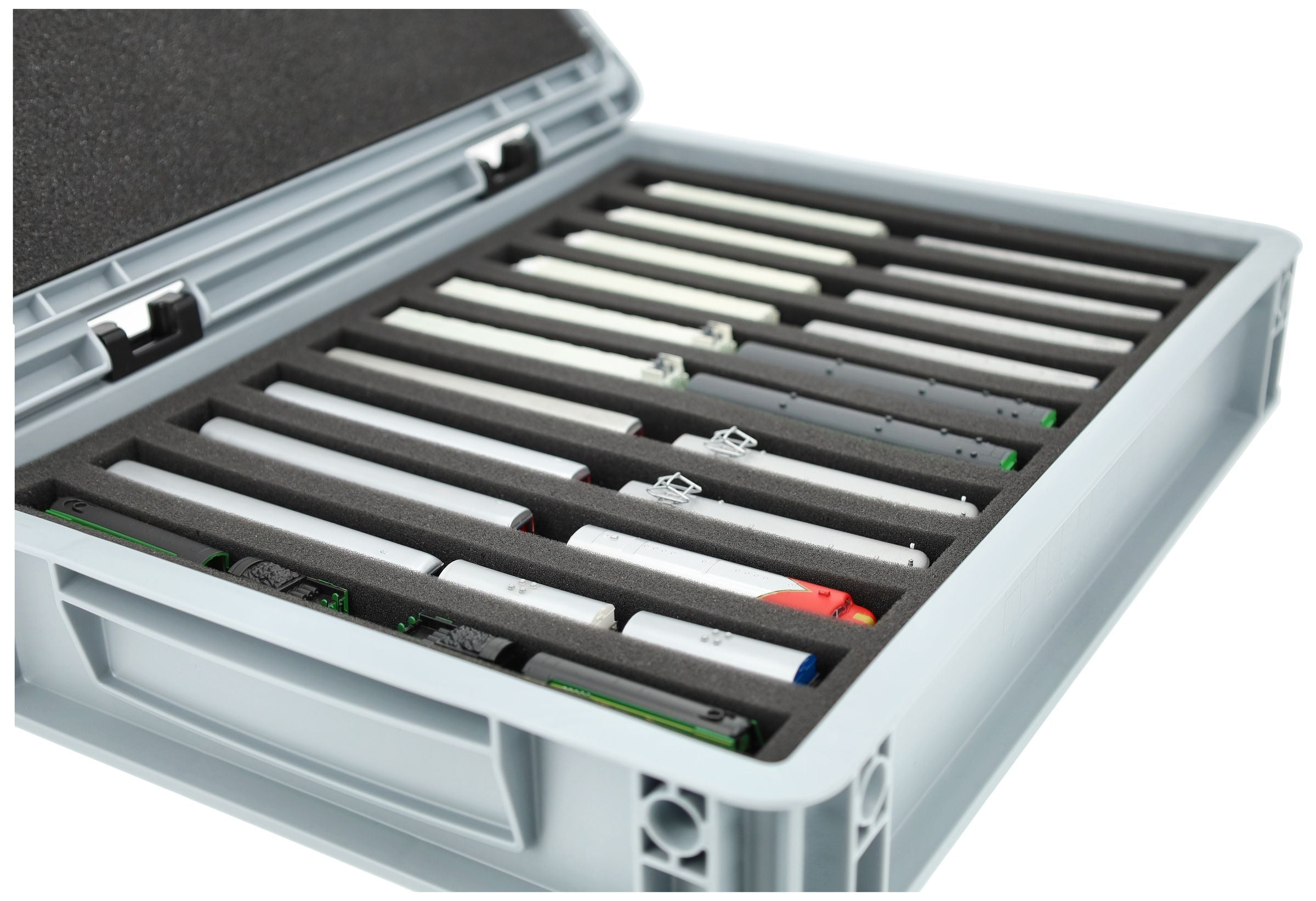Für alle, die ihre Spur Z Loks, Waggons und Fahrzeuge sicher und kompakt transportieren möchten: Dieses Feldherr Set kombiniert eine stapelbare Eurobox mit maßgeschneiderter Schaumstoffeinlage. Ob für die Fahrt zum Eisenbahner-Stammtisch, Modultreffen oder als platzsparende Lagerlösung daheim - deine Modelle sind jederzeit gut geschützt.