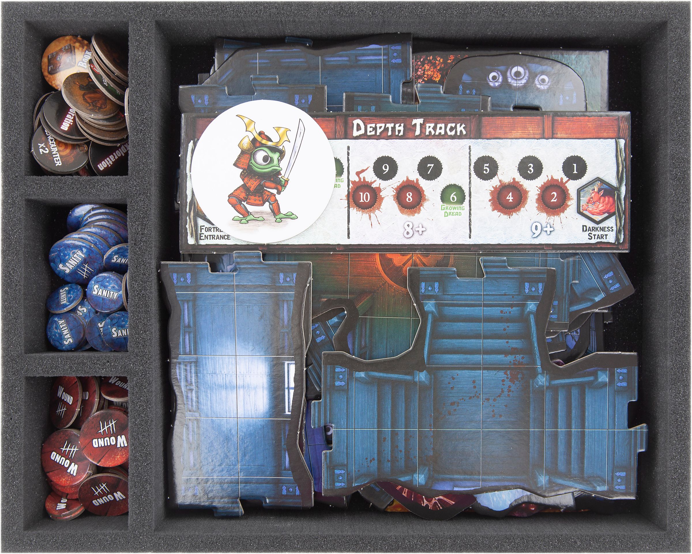 - Das Set bietet Platz für alle Miniaturen und das gesamte Spielmaterial aus dem „Shadows of Brimstone: City of the Ancients“ Grundspiel von Flying Frog Productions.