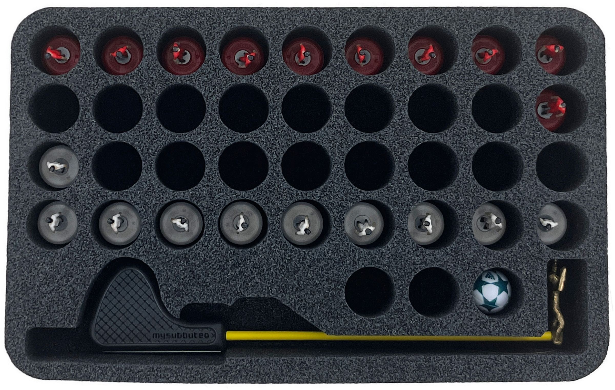Hier hast du Platz für insgesamt drei Subbuteo Teams, drei Bälle/Einzelspieler und einem Torwart. Jedes Team bekommt maßgeschneiderte Fächer für jeweils 12 Feldspieler-Figuren.