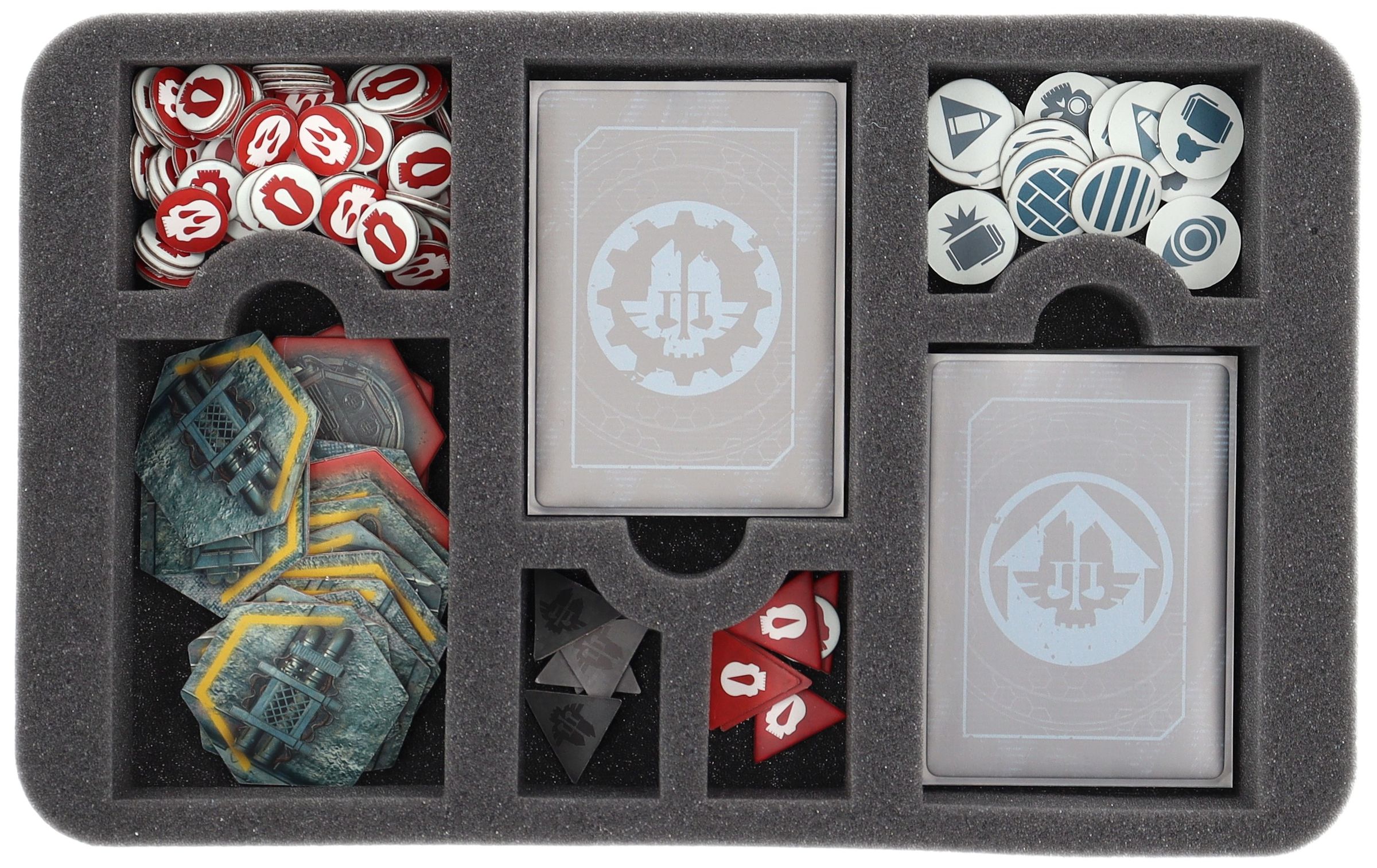 - 1 Half-Size Schaumstoffeinlage mit 7 Fächern für Spielmaterial wie Karten im Format 63 mm x 88 mm (Standard Card Game Size), Token und Würfel (HSMEQO050BO)