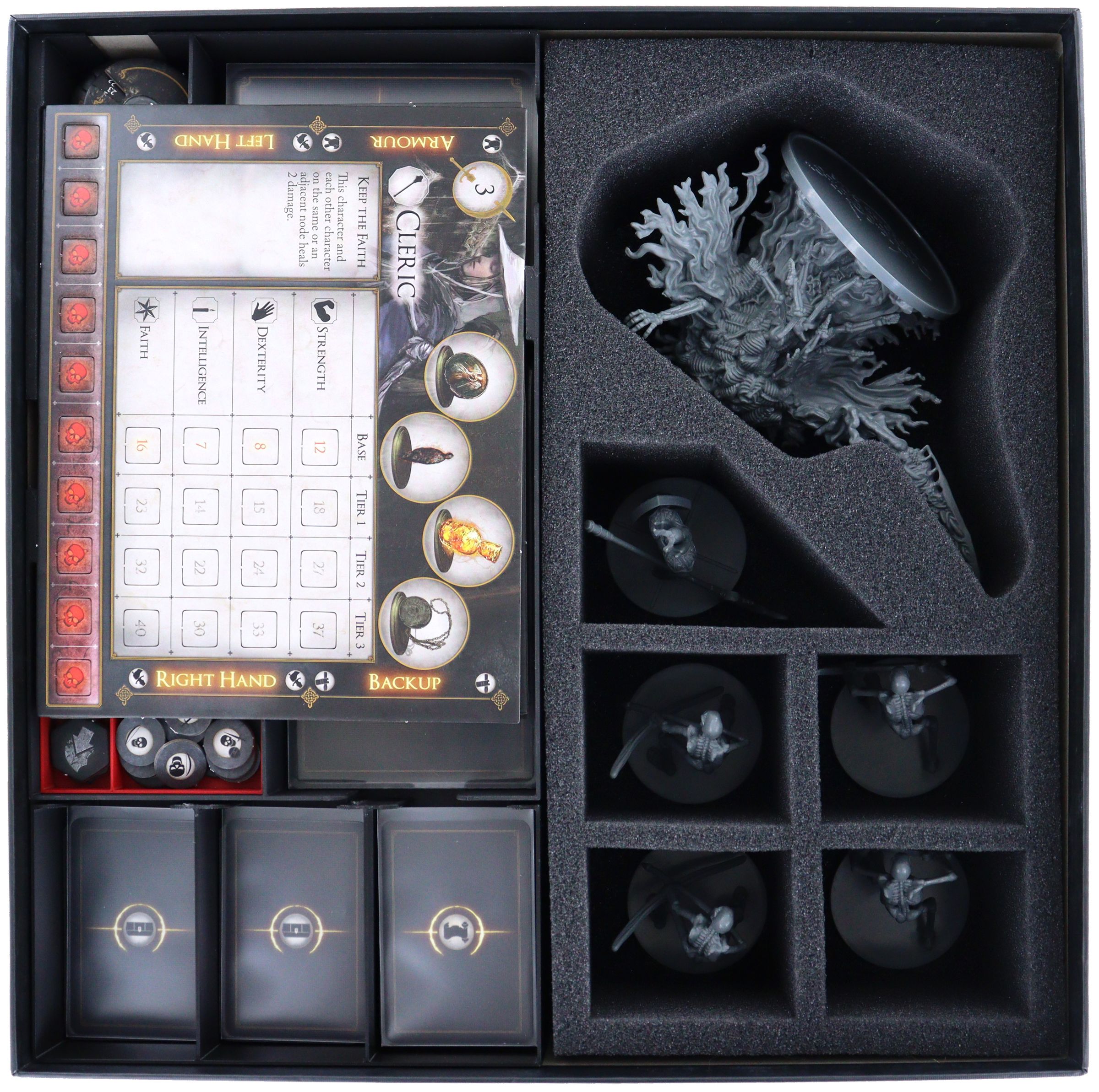 In den finsteren Tiefen der Katakomben führt dich ein geheimer Pfad in die Dunkelheit. Dort, in den lichtlosen Gräbern der Riesen, wartet der Fürst des Grabes Nito. Um sicherzustellen, dass dein Spielcharakter nicht in seine Einzelteile zerfällt und du dich mühelos zwischen Miniaturen und Token zurechtfindest, unterstützen wir dich mit diesem Feldherr-Schaumstoff-Set mit Organizer.