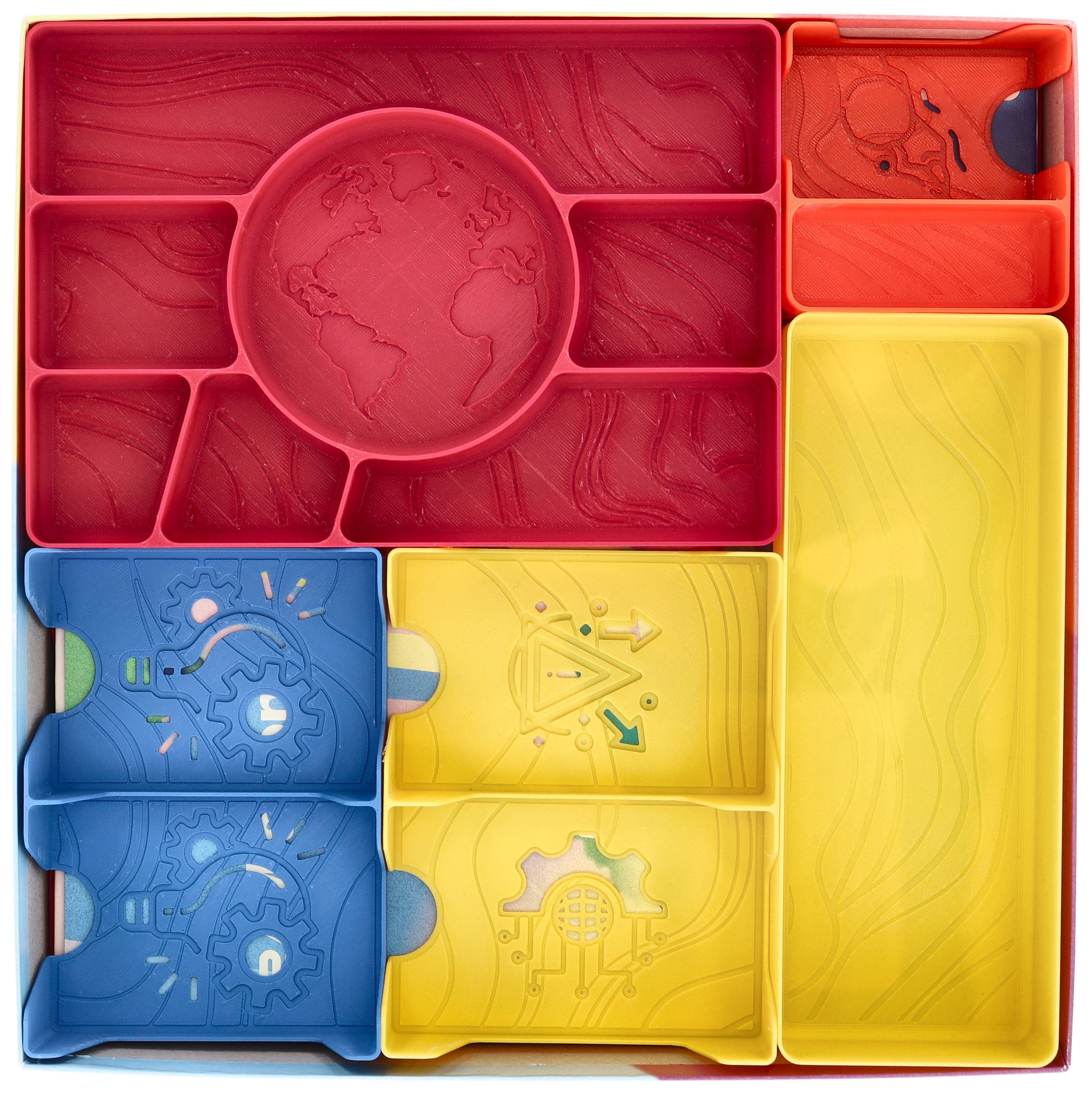 - Individuell gestaltete Fächer mit Symbolen passend zu den Komponenten erleichtern die Sortierung aller Tokens und beschleunigen den Spielaufbau.