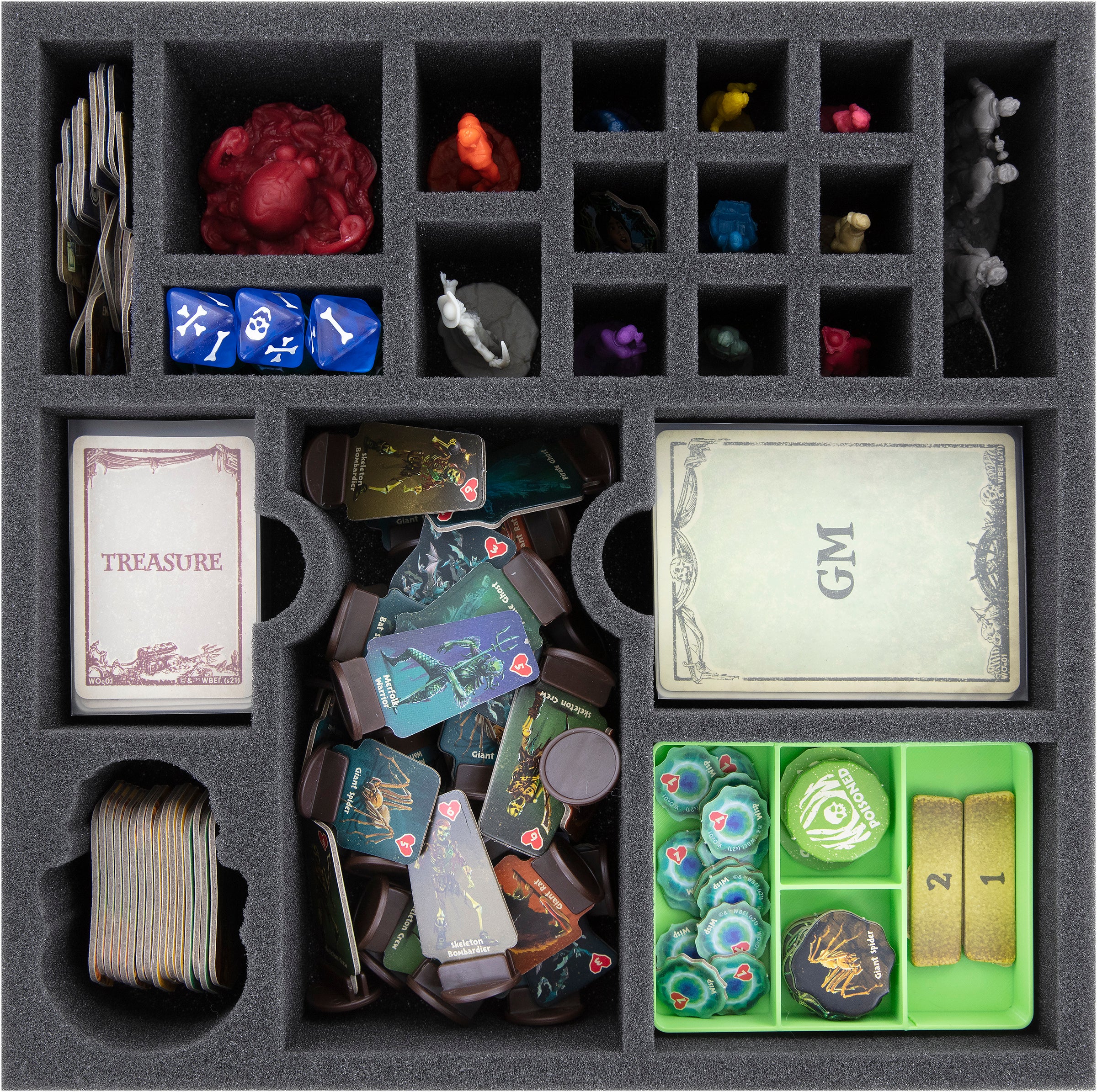 - 3 Token-Trays aus Kunststoff mit jeweils vier Fächern für kleinteiliges Spielmaterial wie Wish Tokens, Bone Pile Tokens, Start Token, Rubble Tokens, Sand Tokens, Web Tokens, Poisoned Tokens, Wisp Foe Tokens, Unexplored Tokens, Trapped Tokens, Damage Tokens, GM Tokens