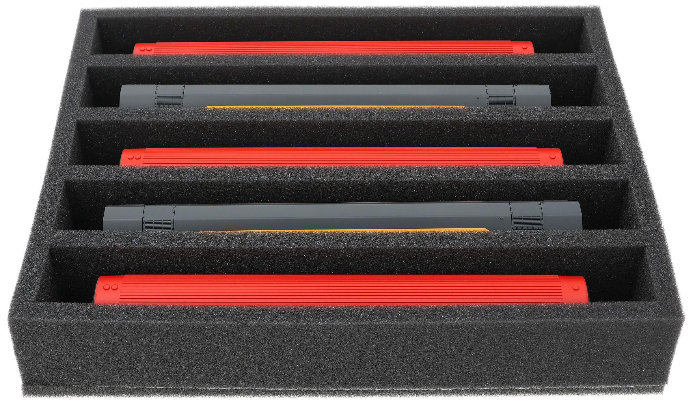 Ordentlich aufbewahrt und sicher transportiert. Mit dieser Feldherr Full-Size Schaumstoffeinlage für Modelleisenbahnen in Spur H0 sind Ihre Modelle sicher.