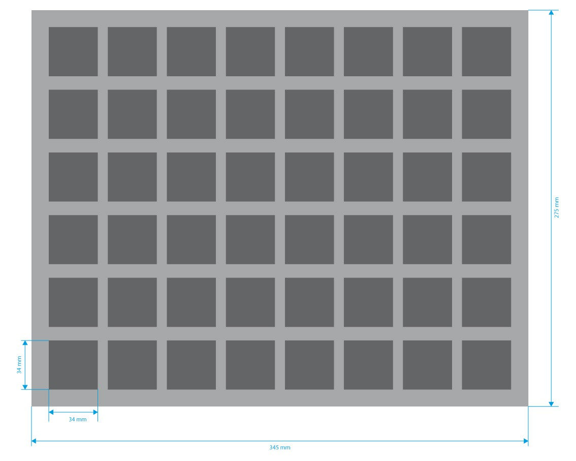 Die 70 mm Schaumstoffeinlage mit 48 Fächern (34 mm x 34 mm x 60mm) für Krosmaster Arena Spielfiguren.