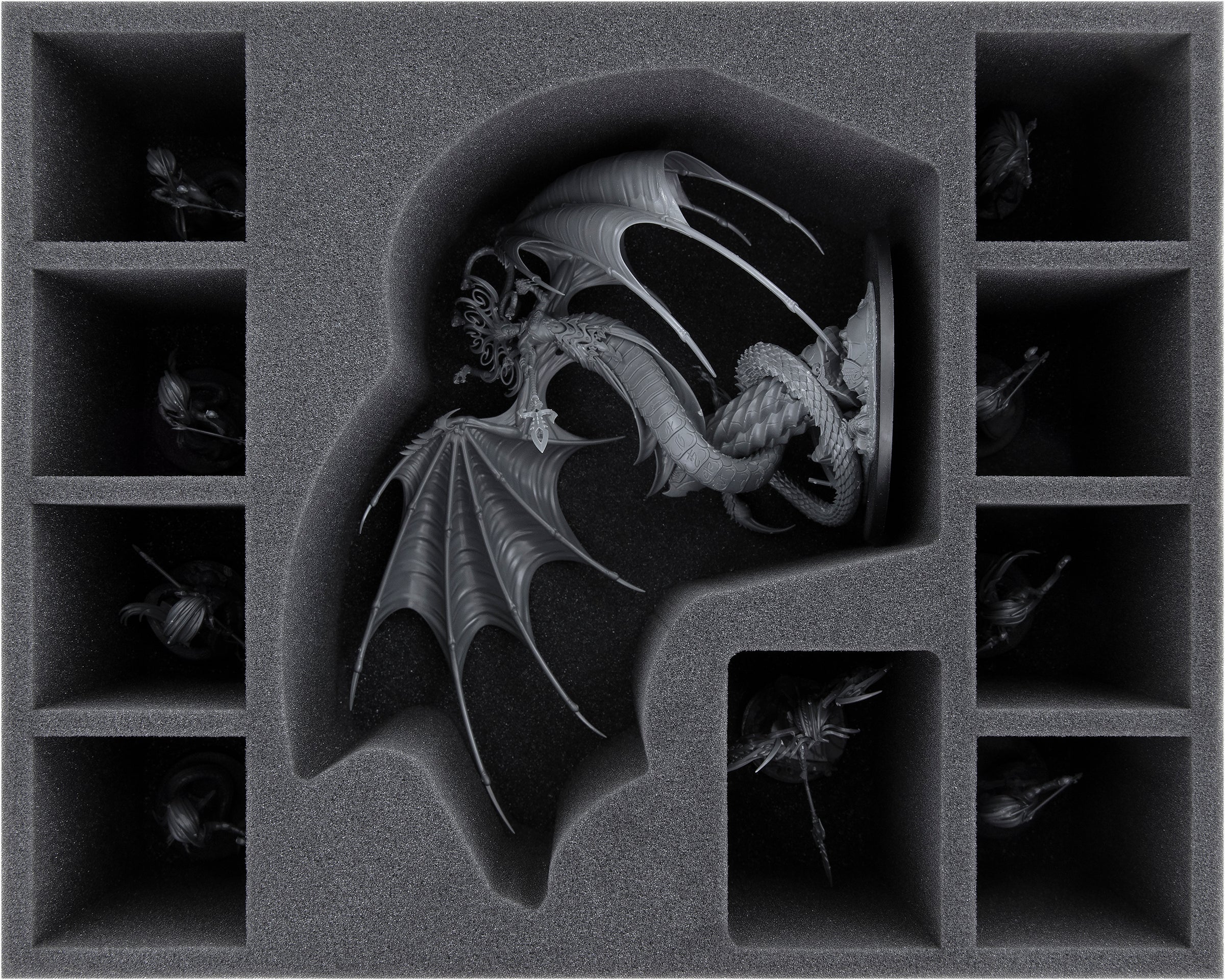 Ein exakt auf Morathi zugeschnittenes Fach sorgt dafür, dass dein Modell einen festen Sitz hat und beim Transport nicht verrutscht. Der weiche, feinporige Schaumstoff schützt die feinen Details zuverlässig vor dem Abknicken und Abbrechen. Hast du die Shadow Queen bemalt, so kannst du sicher sein, dass der Schaumstoff auch vor Kratzern und abplatzender Farbe schützt.