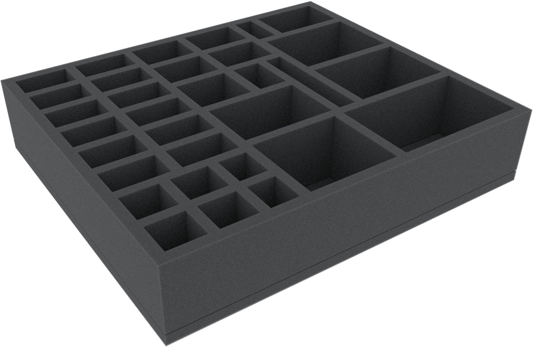 This foam tray has 32 compartments for the safe and orderly storage of tokens, markers, dice, cards, and/or miniatures. It fits many original game boxes.