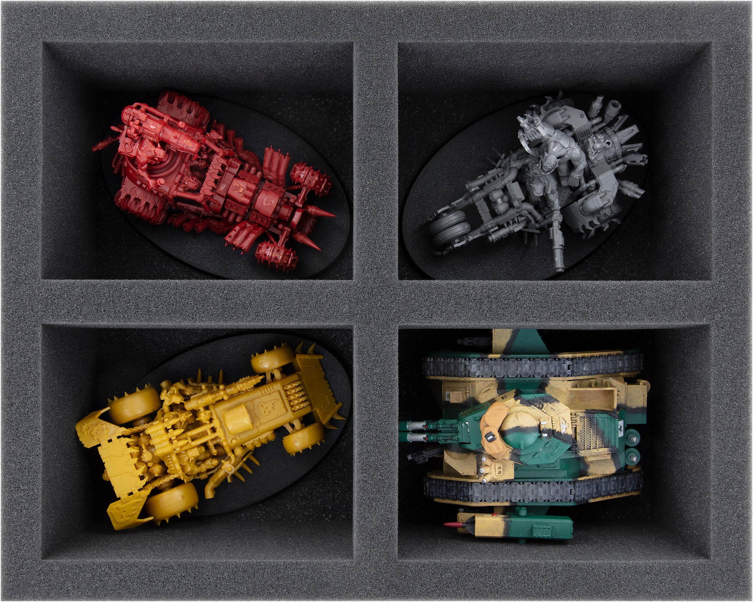 On this Feldherr foam tray you have space for up to 4 large miniatures of your army. The insert is especially suitable for storing the Ork Deffkilla Wartrike, Megatrakk Scrapjet, Rukkatrukk Squigbuggy, Shokkjump Dragsta and similar sized models.