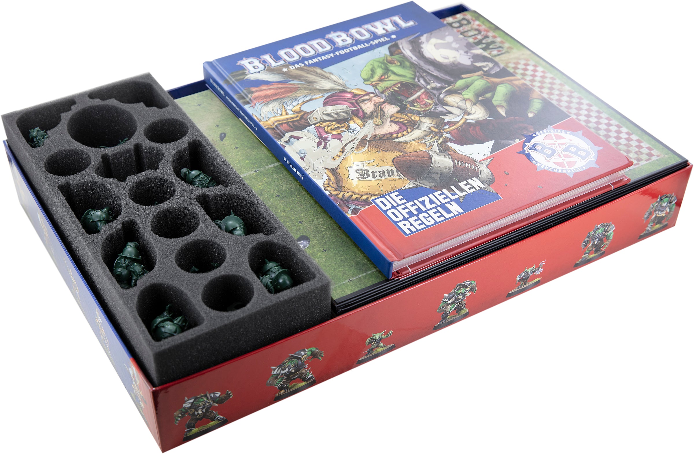 What remains the same, however, is that there is once again a fantastic starter set, filled to the brim with everything you need for gloriously brutal games. So that the broken bones are limited to the playing field and you always keep the overview, we provide you with this Feldherr foam set, suitable for your board game box.