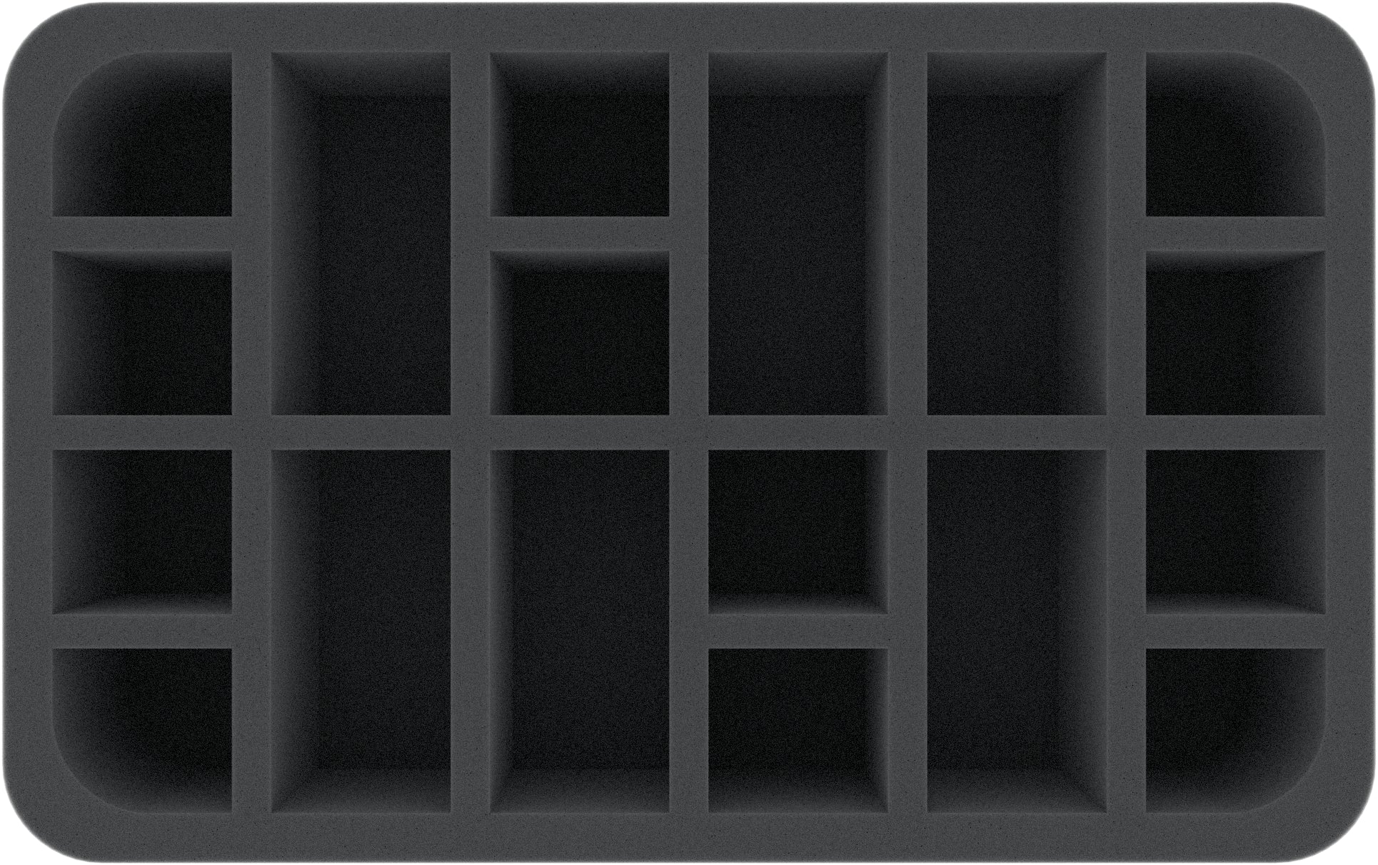 In the 18 compartments on this Feldherr Half-Size foam tray, each player on your Lizardmen team is assigned their own compartment. All 6 Saurus Blockers are accommodated in the oblong compartments, on the remaining small compartments you distribute 4 Skink Runners, 2 Chameleon Skinks, the two Slann statues, as well as the balls and team coins.