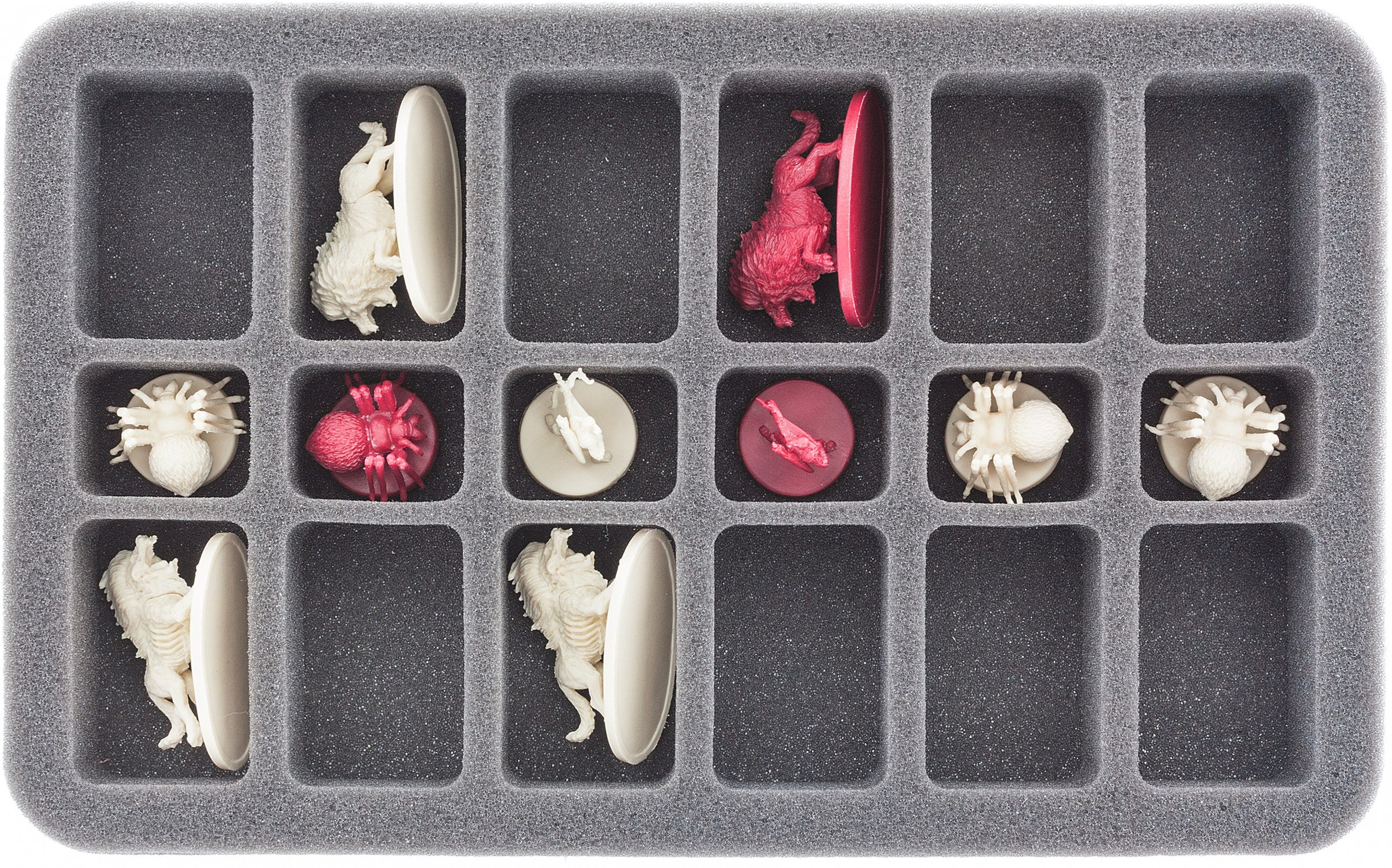 Even heroes and monsters need a place to feel safe. This Feldherr Half-Size foam tray with its 12 medium-sized and 6 small compartments makes sure that your Descent miniatures are padded softly.