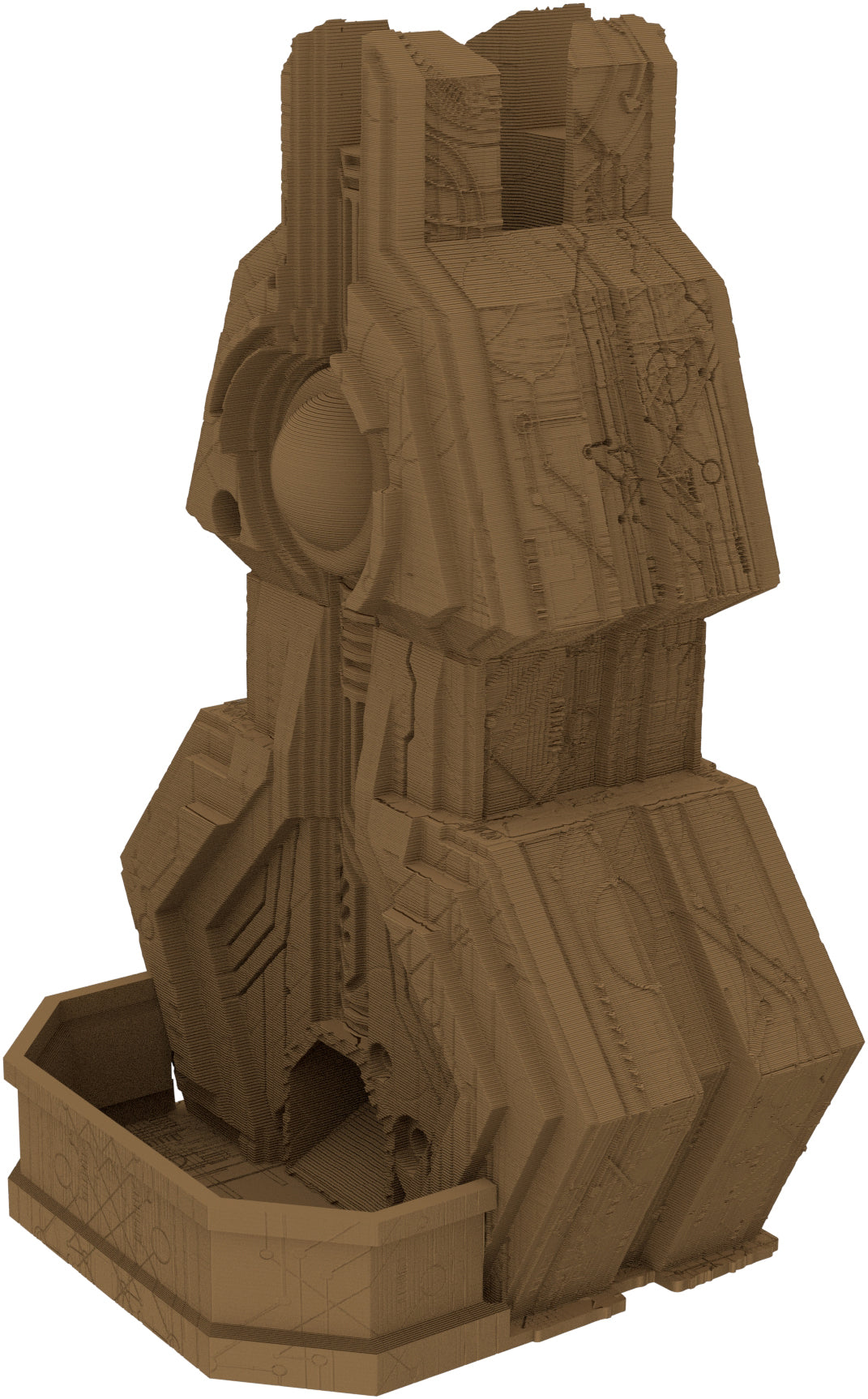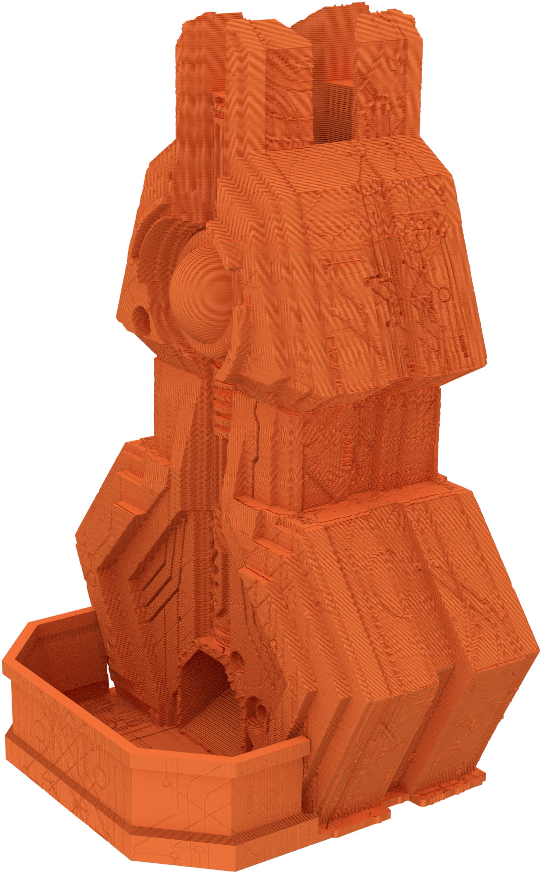 3D printed - detailed dice tower, with removable roof and exchangeable dice tray. The Dice Tower can also be used as a terrain part for your miniatures game or as a center piece for your next DnD session.