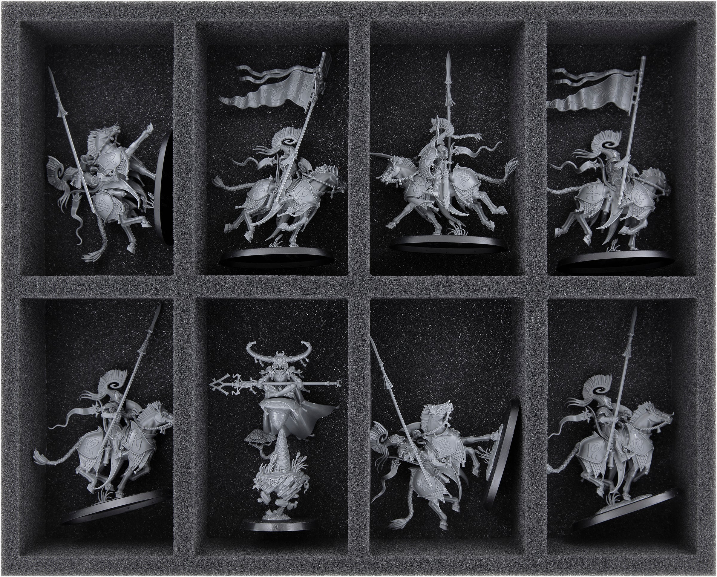 This 50 mm high foam tray is divided into 8 compartments. It is particularly suitable for Vanari Dawnriders and similar sized miniatures.