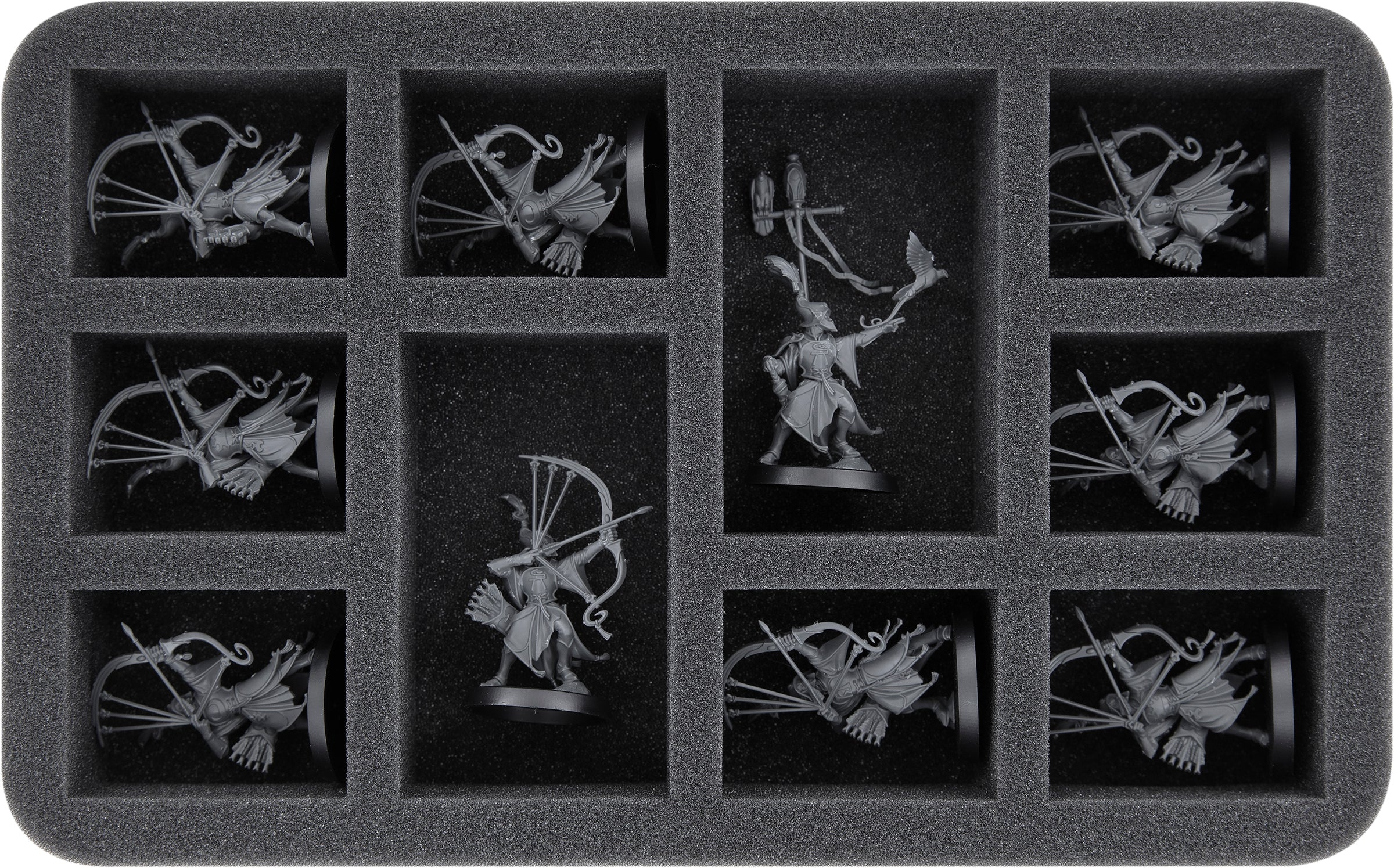 This Half-Size foam tray provides space for up to 10 models of your Lumineth Realm-lords army. It is particularly suitable for Vanari Auralan Sentinels and similar sized miniatures.