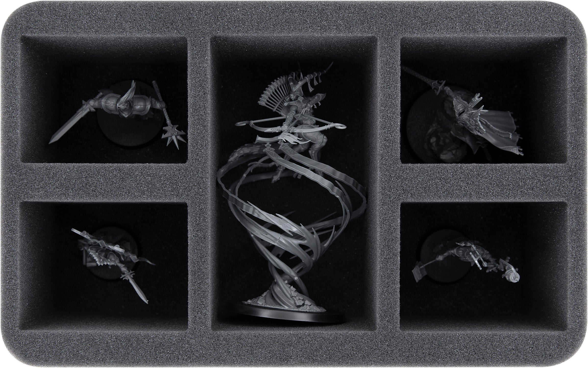 On this Feldherr foam tray you have space for up to 5 miniatures of your Lumineth Realm-Lords. The insert is especially suitable for storing standard infantry models like Sevireth, Lord of the Seventh Wind, Light of Eltharion and similar sized models.