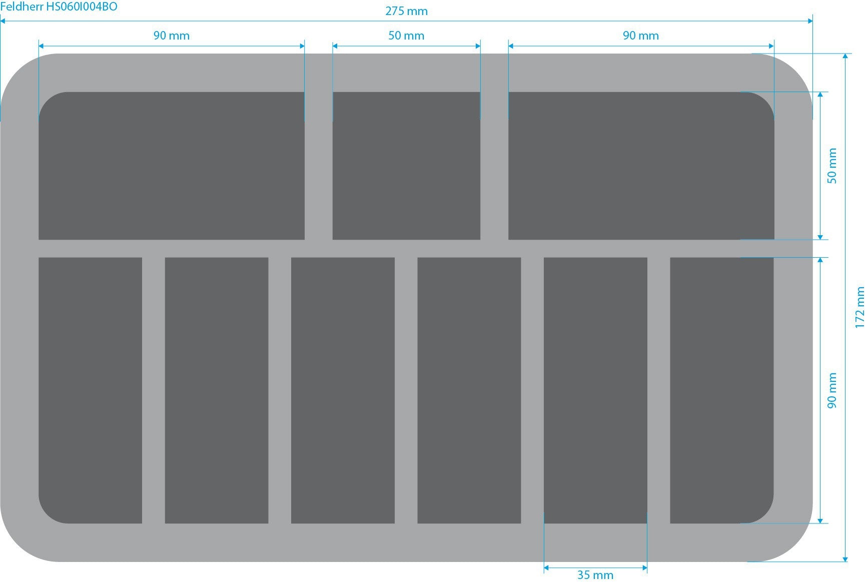 - 6 compartments: 90 mm long x 35 mm wide x 30 mm deep