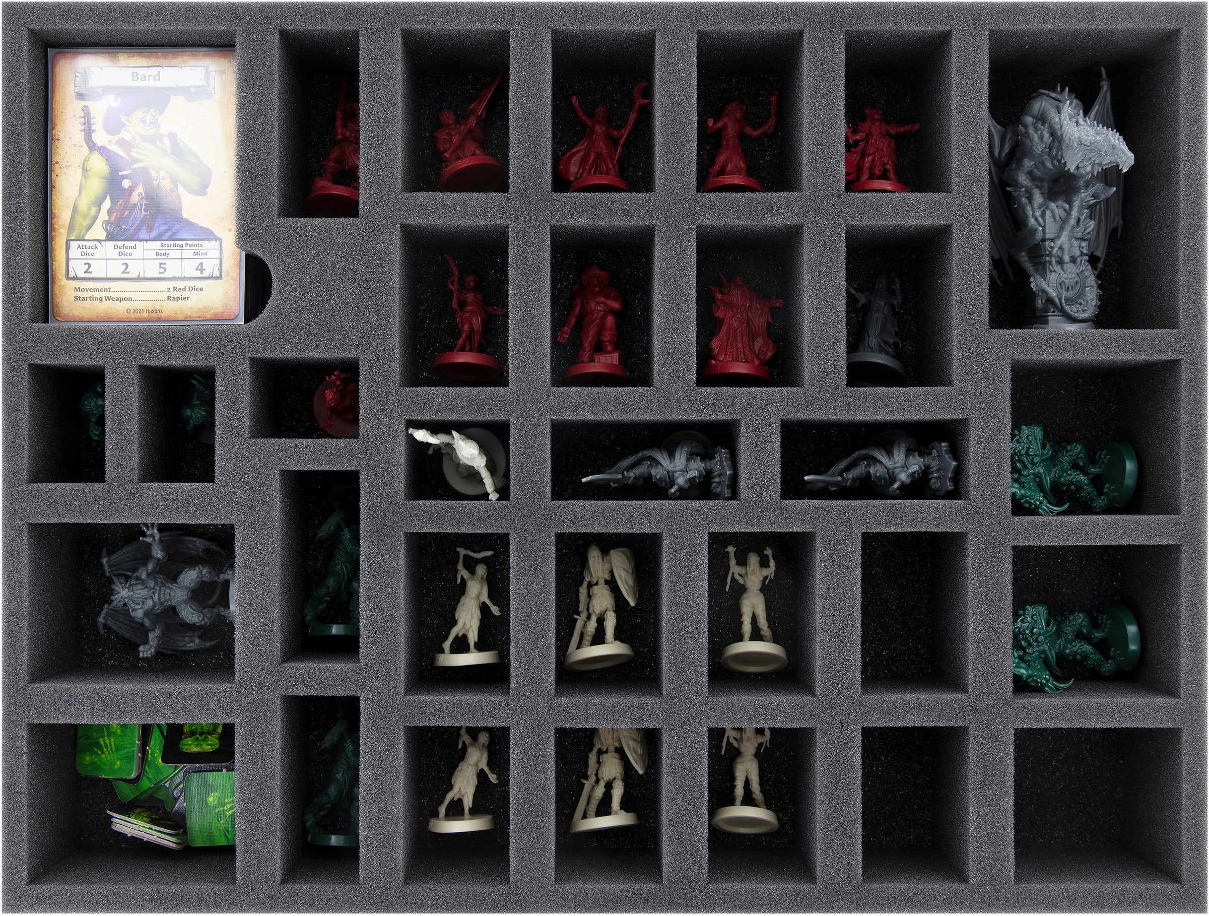- All miniatures, game cards, and the entire game materials from the core game, the two expansions “Kellar's Keep” and “Return of the Witch Lord”, as well as the additional content from the exclusive Mythic box can be neatly stored in the foam set.