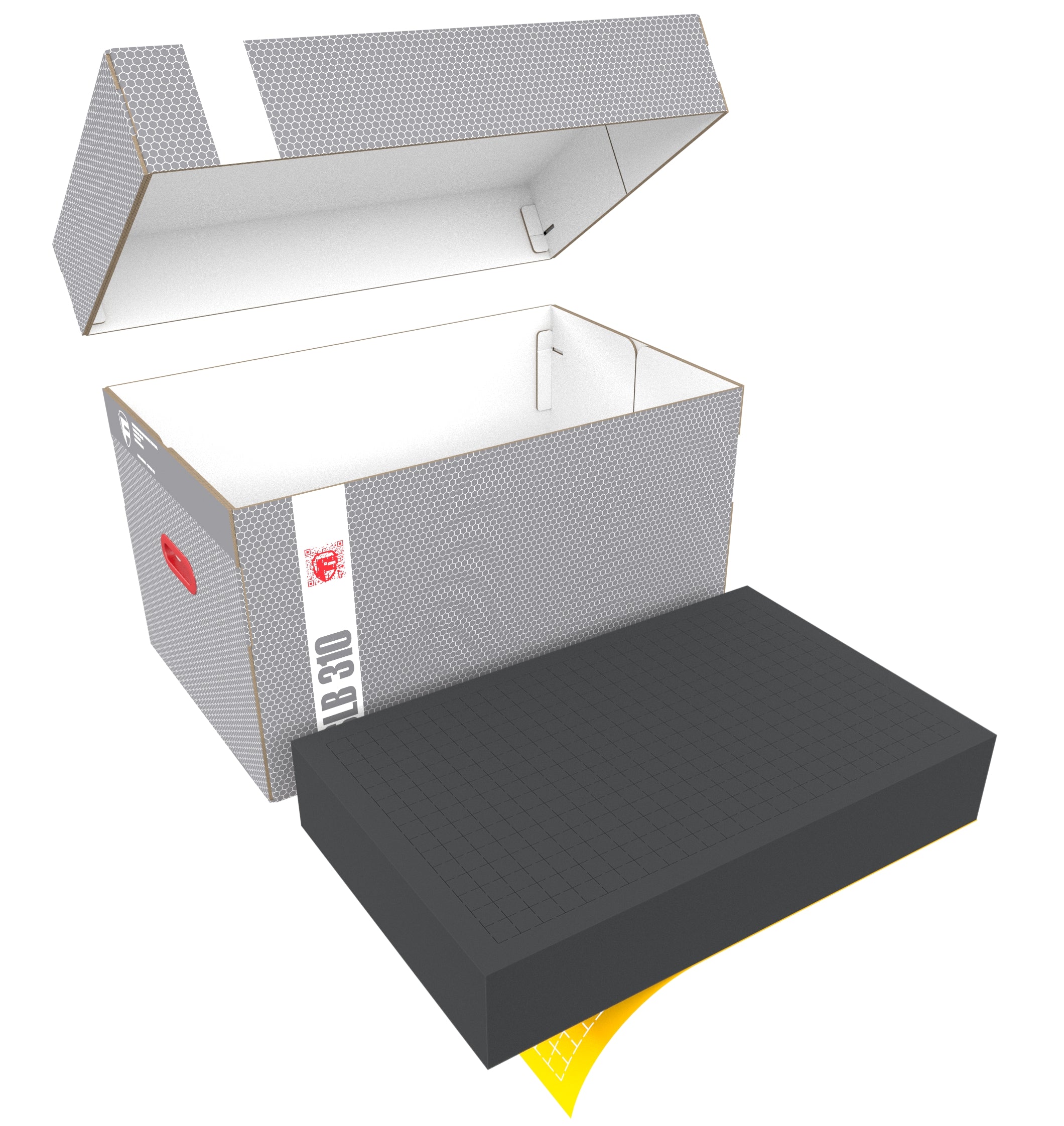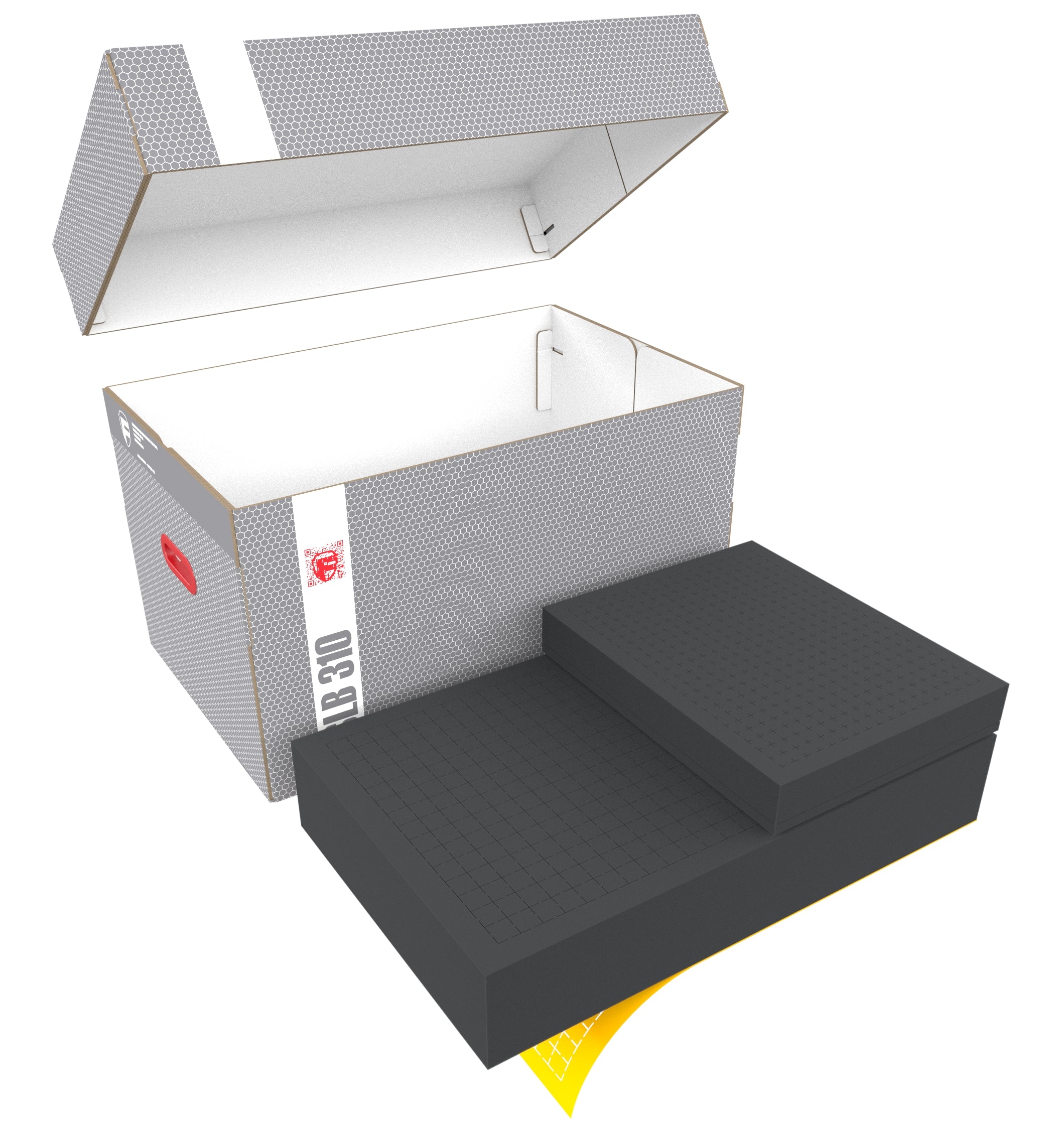 The Storage Box DSLB310 is made of coated, double-walled cardboard. This makes it not only pleasantly light, but also very tear-resistant and stable. The attachable lid reliably protects the contents from dust and other external influences. With the appropriate foam trays, miniatures, game material, and all other goods can be stored safely — and conveniently transported with the two plastic-reinforced carrying handles on the sides.