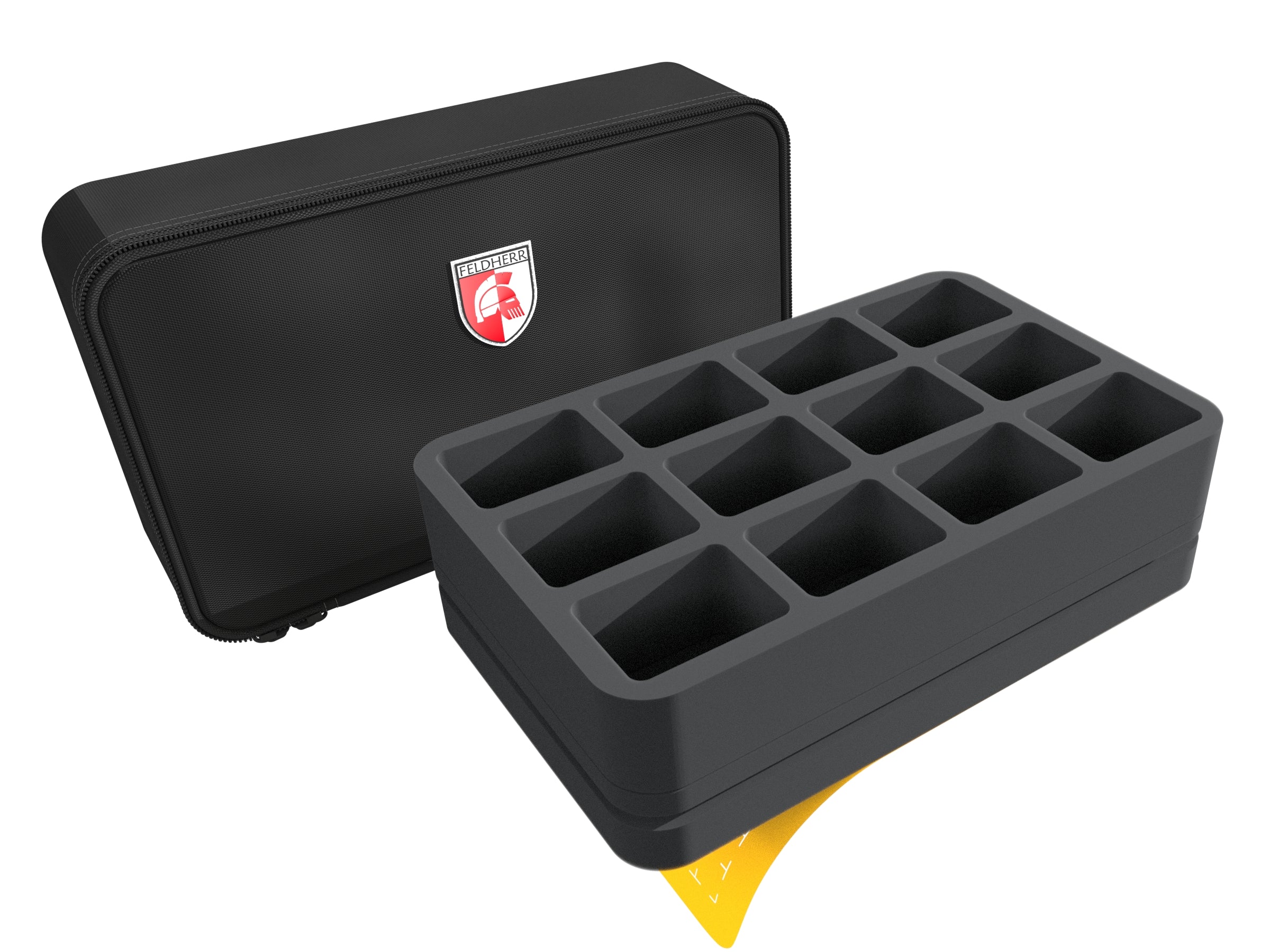 - 1 Half-Size foam tray with 12 compartments for standard infantry models on up to 40 mm bases and game material like tokens and dice (HSMFEN050BO)