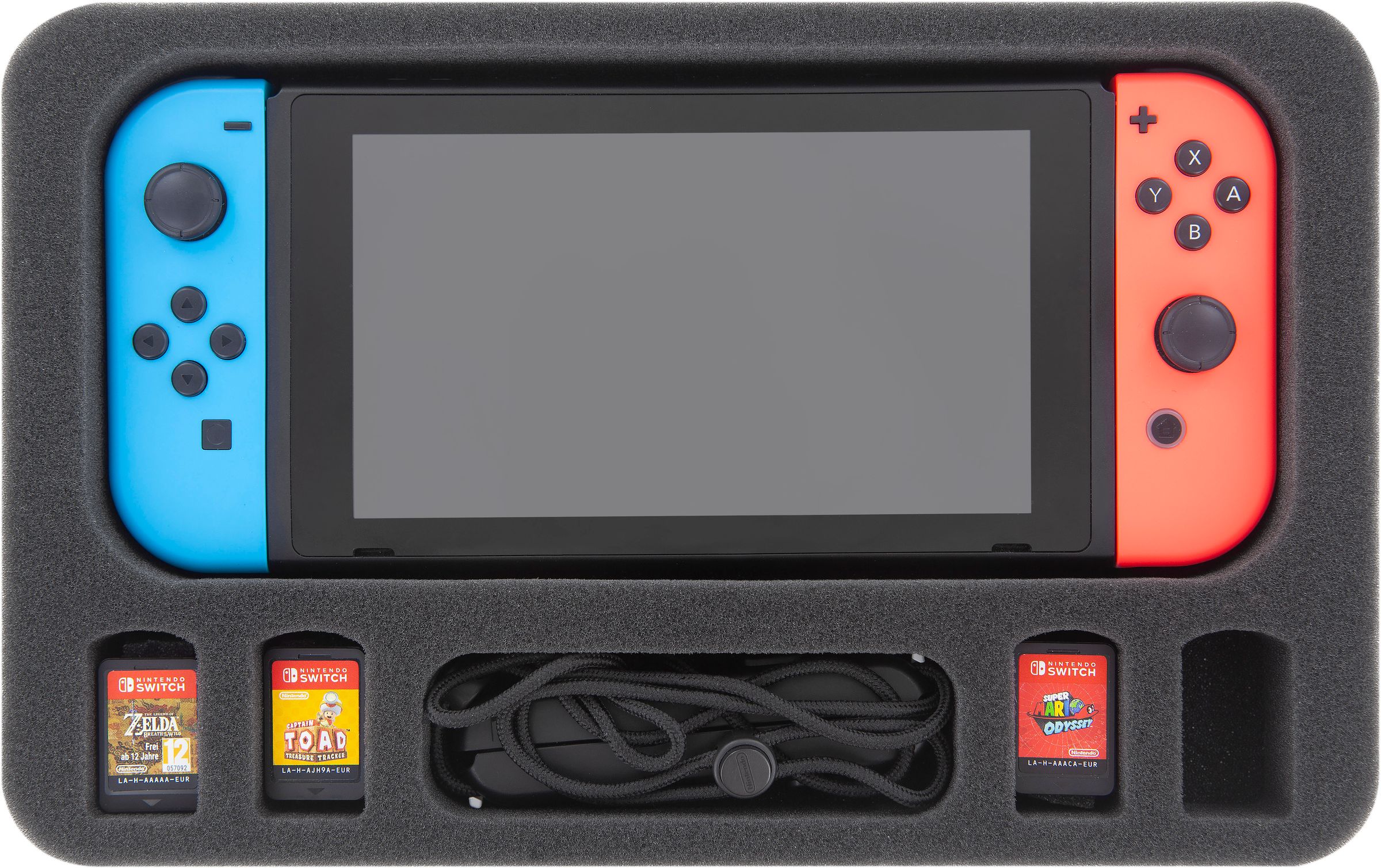 The foam tray has six compartments. The large compartment is custom cut for the assembled console (Touch Screen + two Joy-Cons). Gently nestled in fine-pored foam, the device is optimally protected from scratches and impact damages.