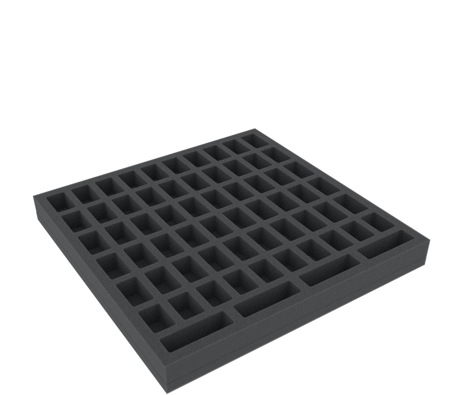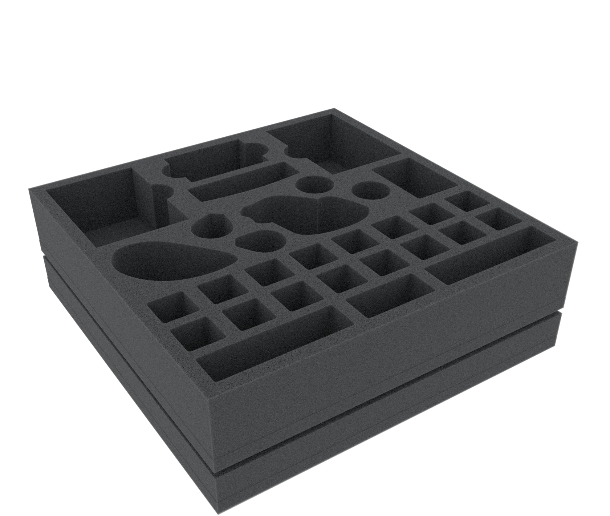 - Foam tray for medium-sized figures und game material: 285 mm x 285 mm x 55 mm total height (45 mm usable height + 10 mm foam base).