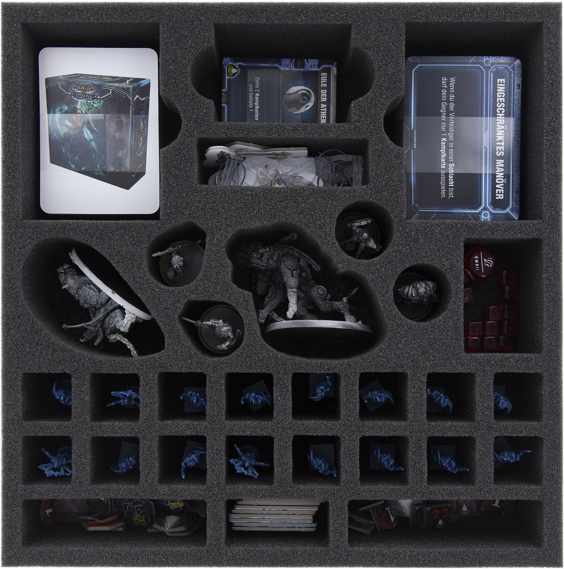 A 90 mm high foam tray harbors the great gods and monsters of Hella. It provides compartments cut exactly for the monuments of Athena, Zeus and Hermes so that five parts do not accidentally turn into more. Completely surrounded by foam, they are hereby optimally protected against damage. In addition to the mighty monuments of the gods, the monster figures of Medusa, Hydra, Chimera, Zyklop and the Minotaurus are also assigned precisely fitting compartments.