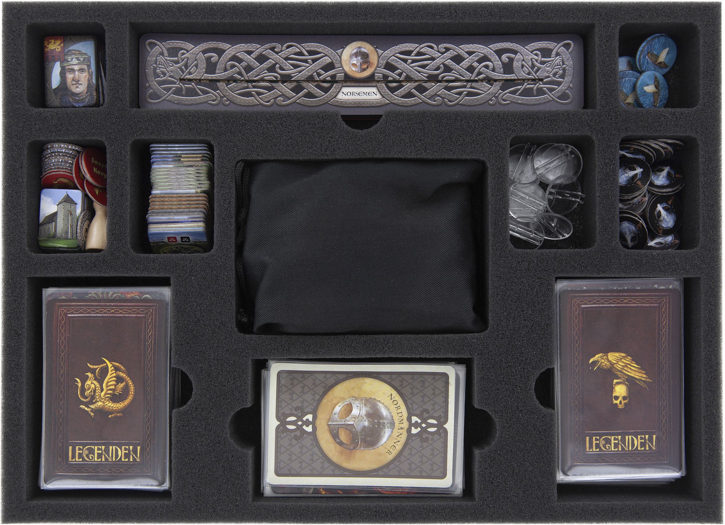 The set consists of two stackable foam trays which we designed to fit into the original board game box. Cut into the foams are tailor-made compartments where you can safely accommodate everything from miniatures and Viking Ship Tokens to dice, card holders and battle cards. In addition, the set contains a foam topper to keep your game material from banging against lid of the board game box