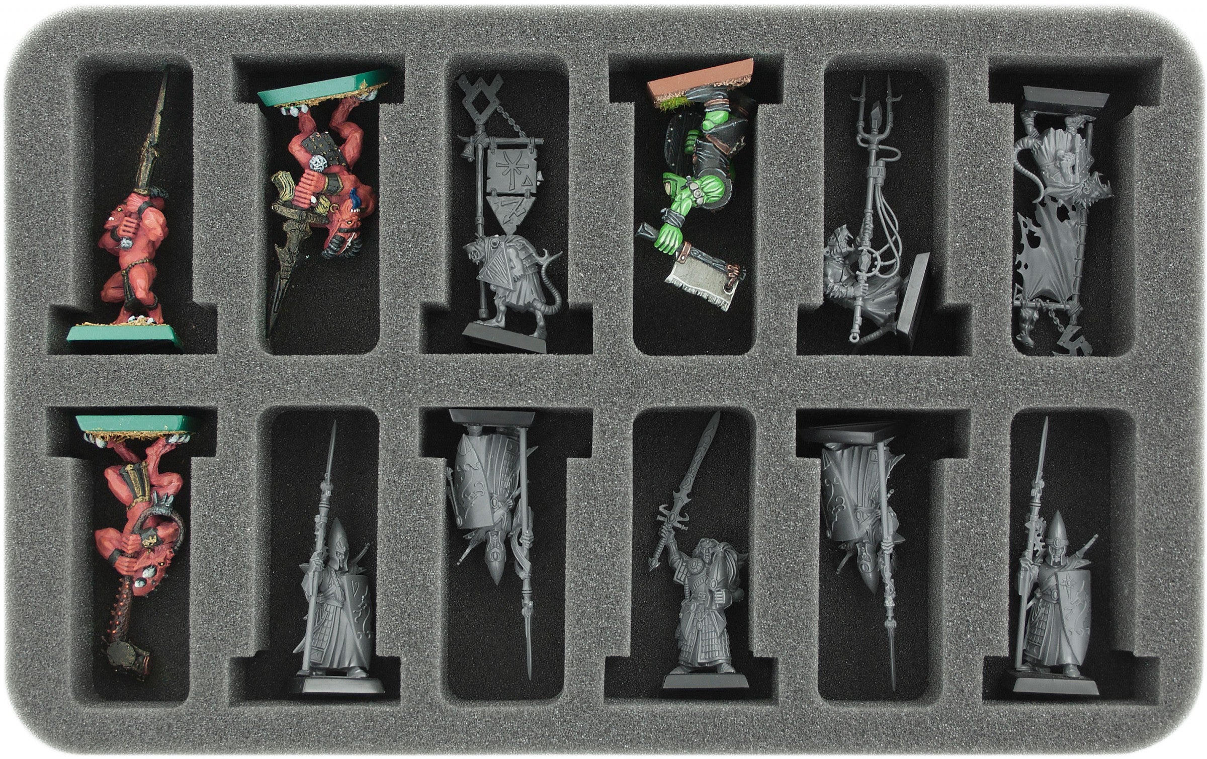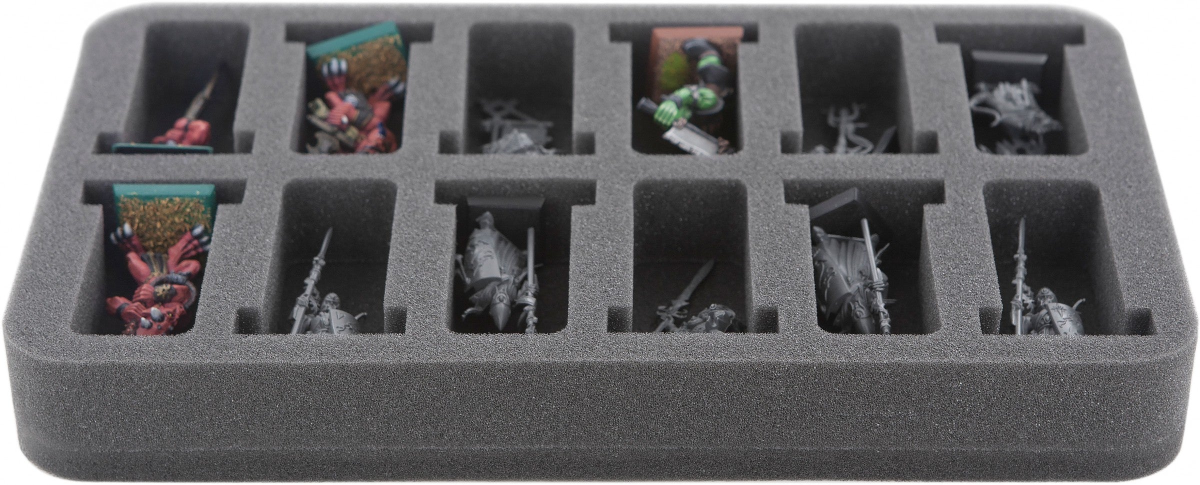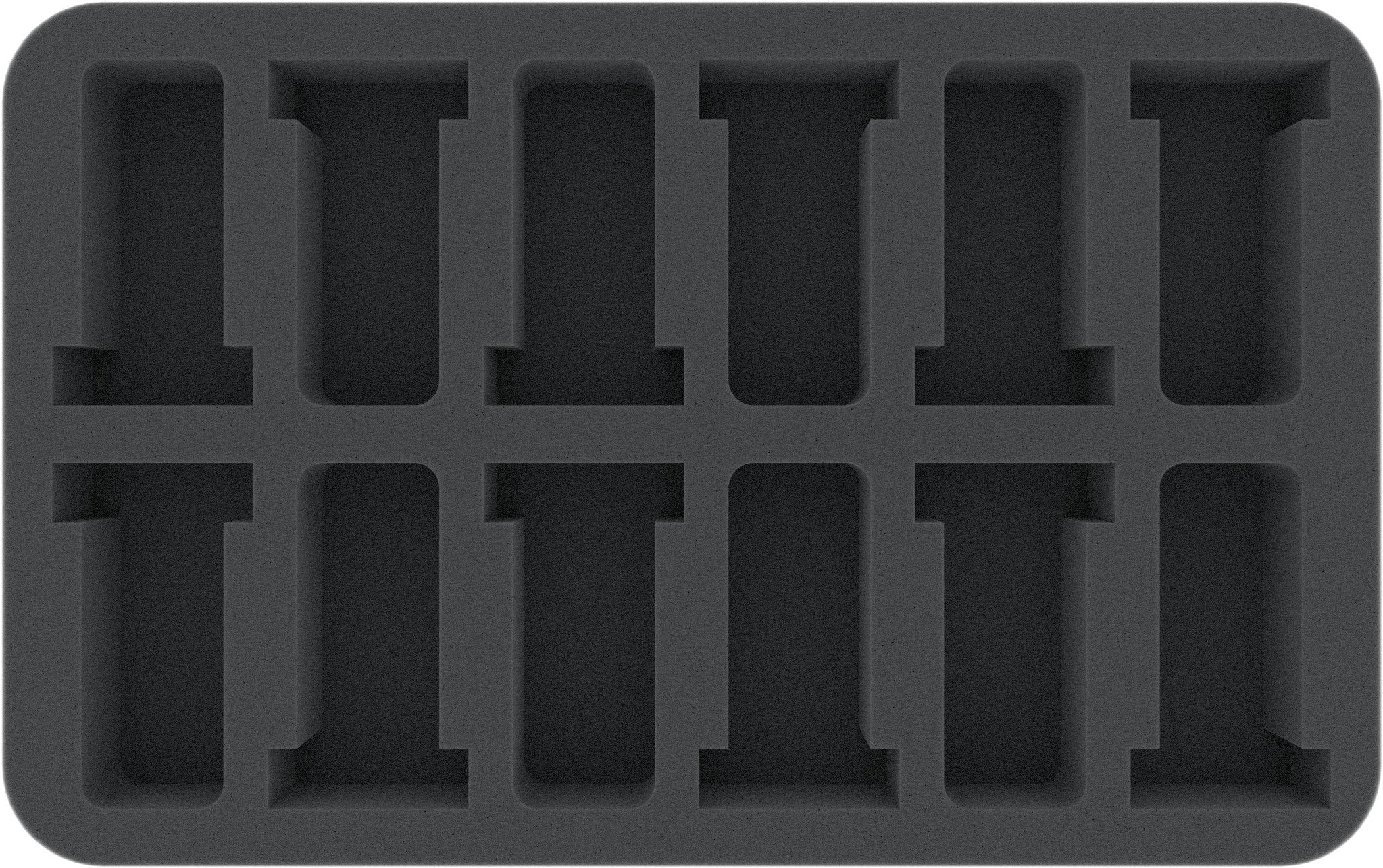 Foam Tray for small miniatures on 25 mm bases. The 35 mm depth of the foam is result from 10 mm foam base and slot foam tray with 25 mm effective depth. The half-size foam tray fits into our Feldherr bags, hard cases, backpacks and storage boxes.