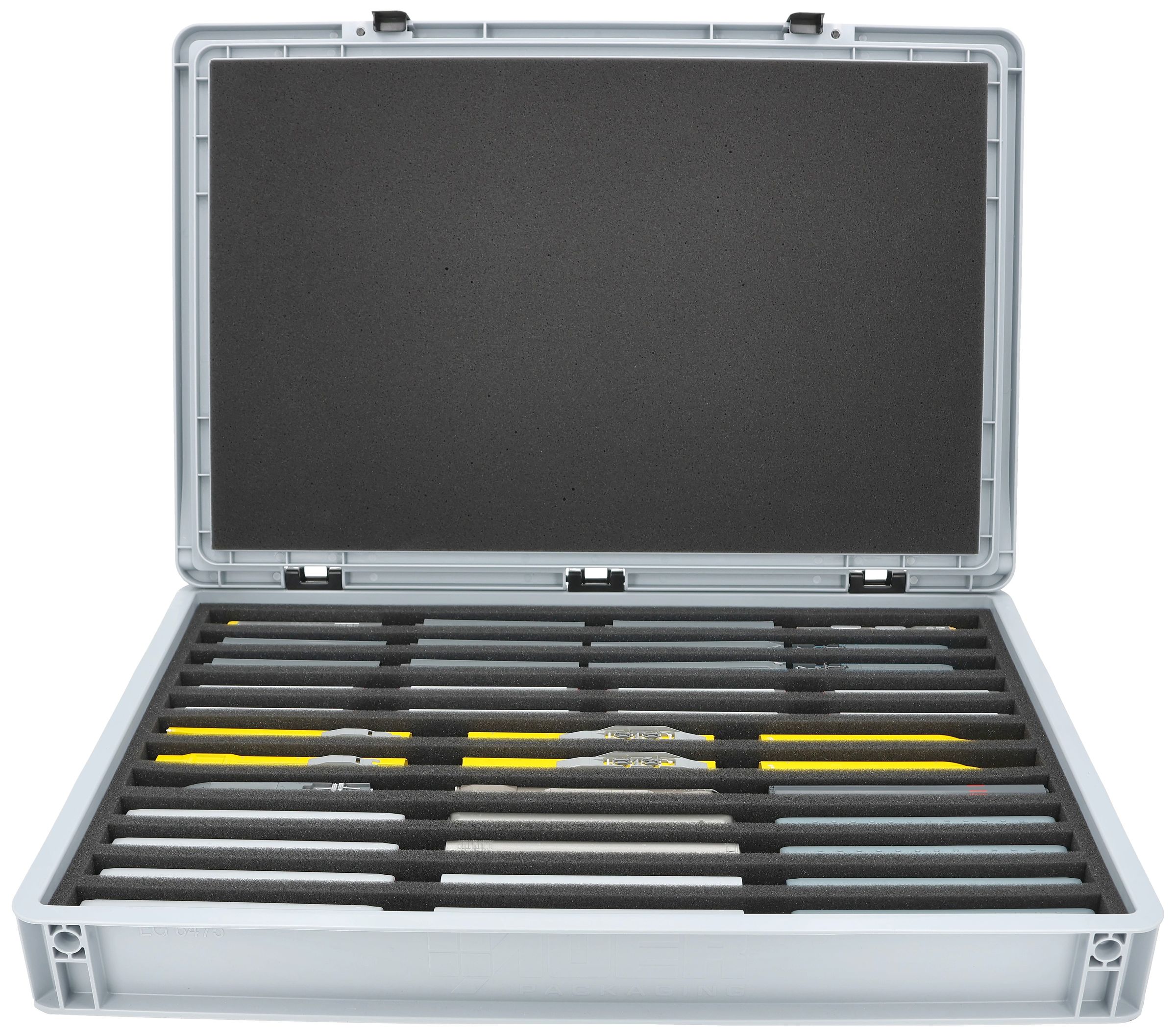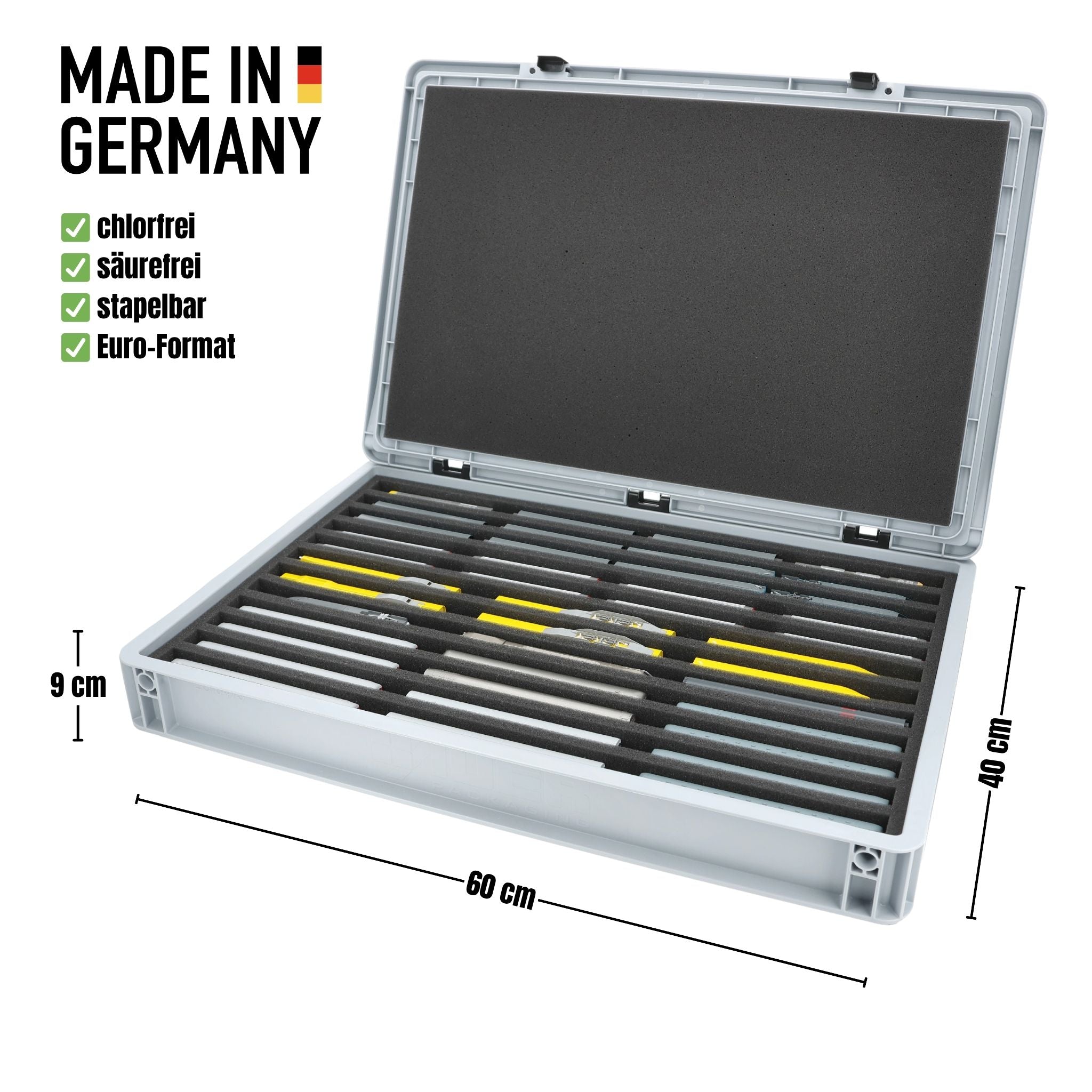 The fine-pored foam reliably protects sensitive details, paintwork and attachments on your models from scratches and damage. The sturdy Eurobox made of shock-resistant plastic provides additional protection from external influences. A simple hinge system with two locks keeps the box securely closed and protects the contents from dust and dirt.