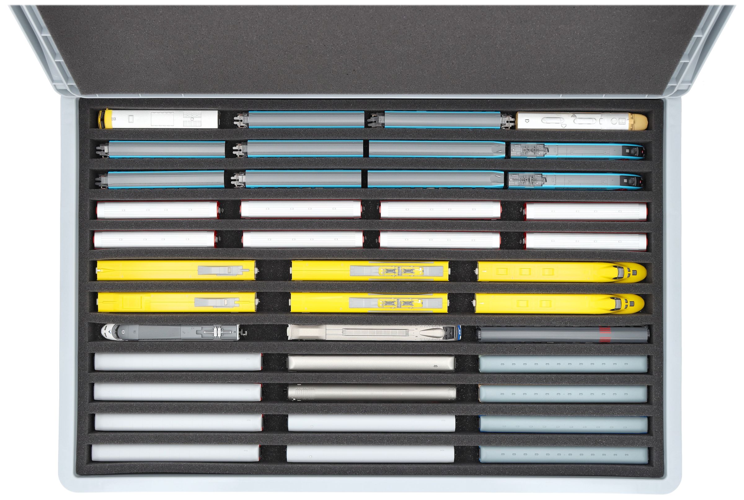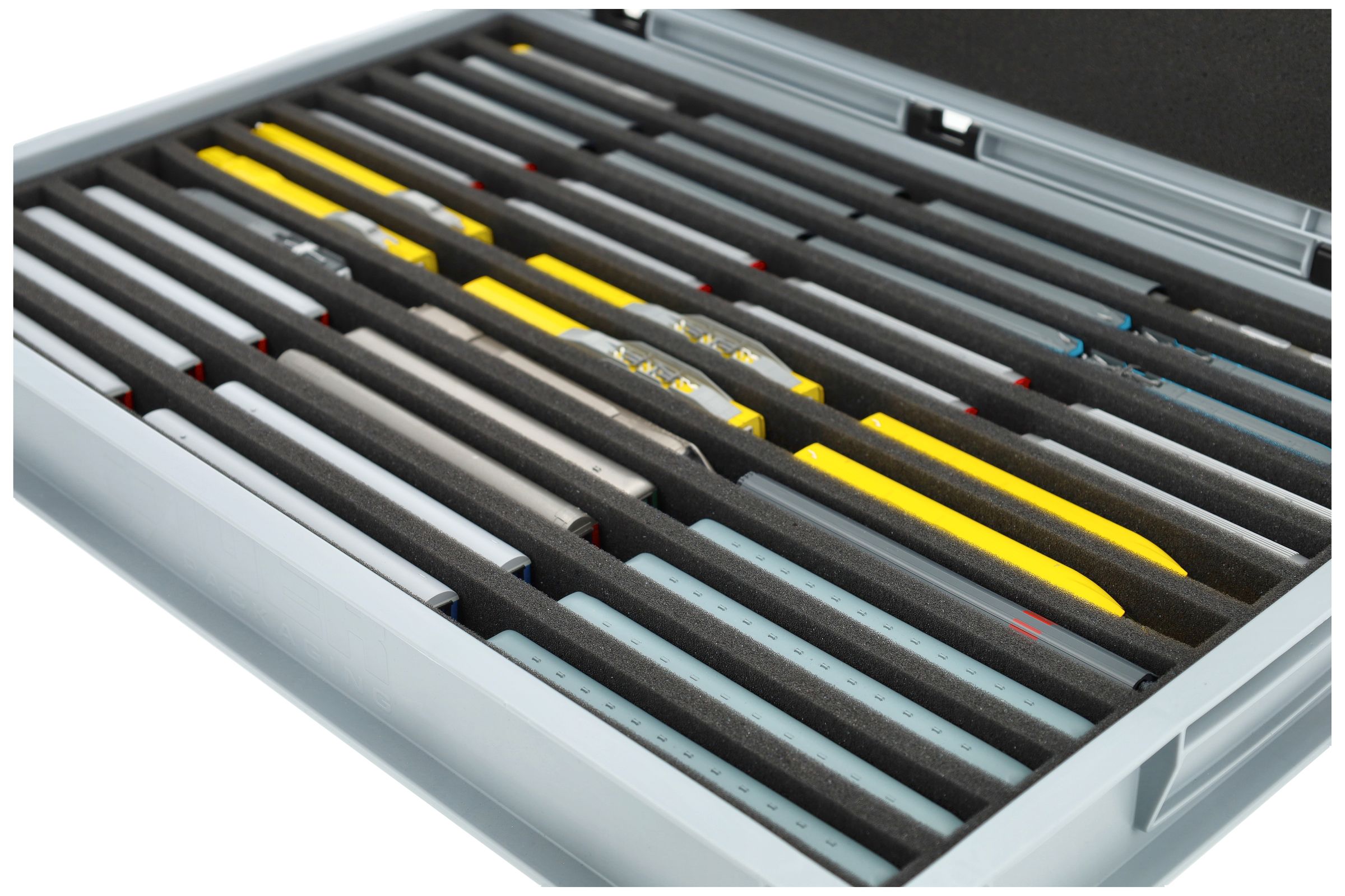The 12 equal-sized compartments (each approx. 550 x 20 x 30 mm) are specially designed for N scale models. Thanks to their length, locomotives and wagons can be placed side by side. The exact fit ensures that the models are securely fixed and do not slip during transport.