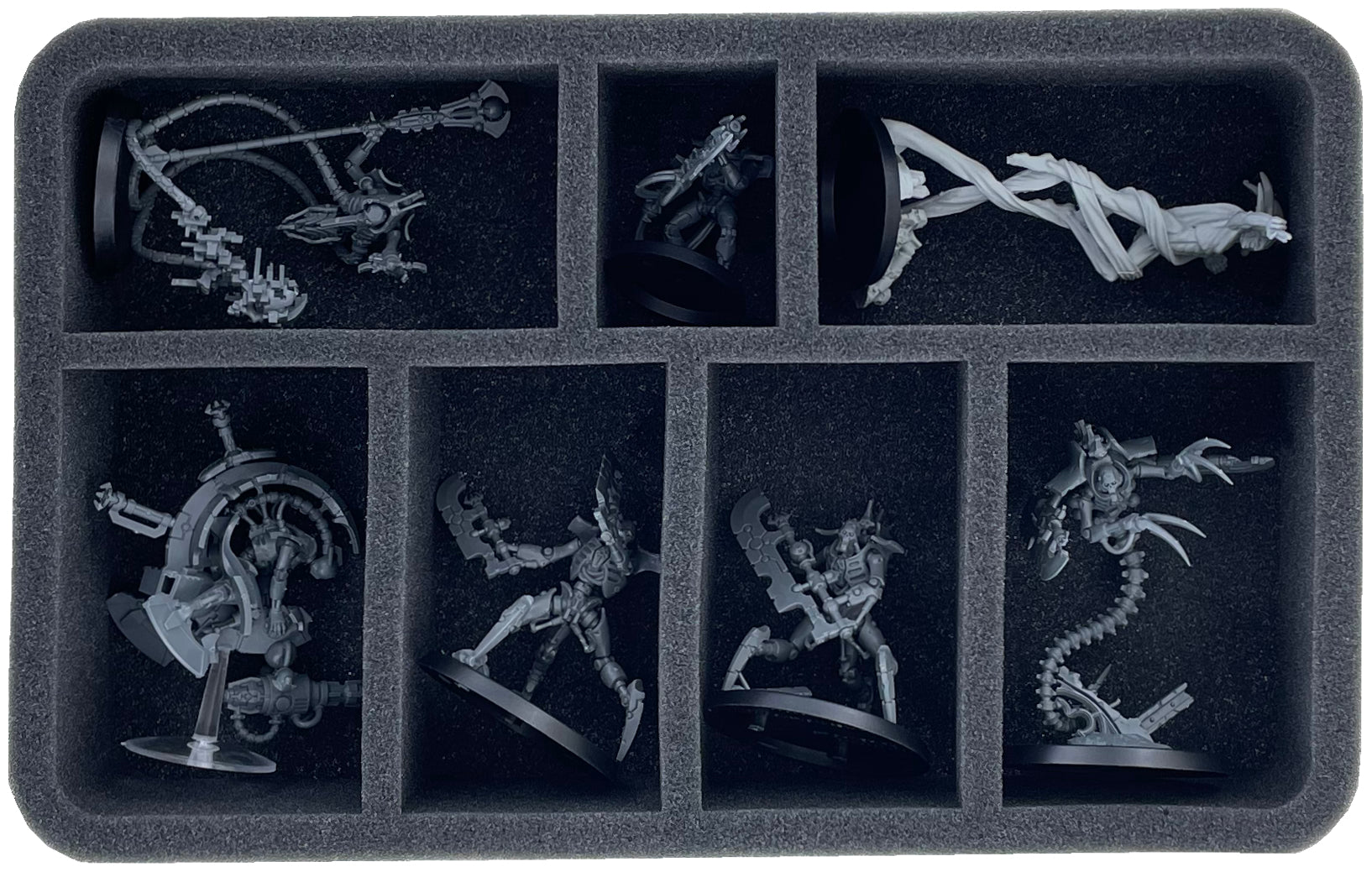 This Half-Size foam tray is divided into 7 compartments to safely store and transport your units. It is particularly suitable for Skorpekh Destroyers, Plasmancer, Plasmazyte, High Lord or similar sized miniatures.