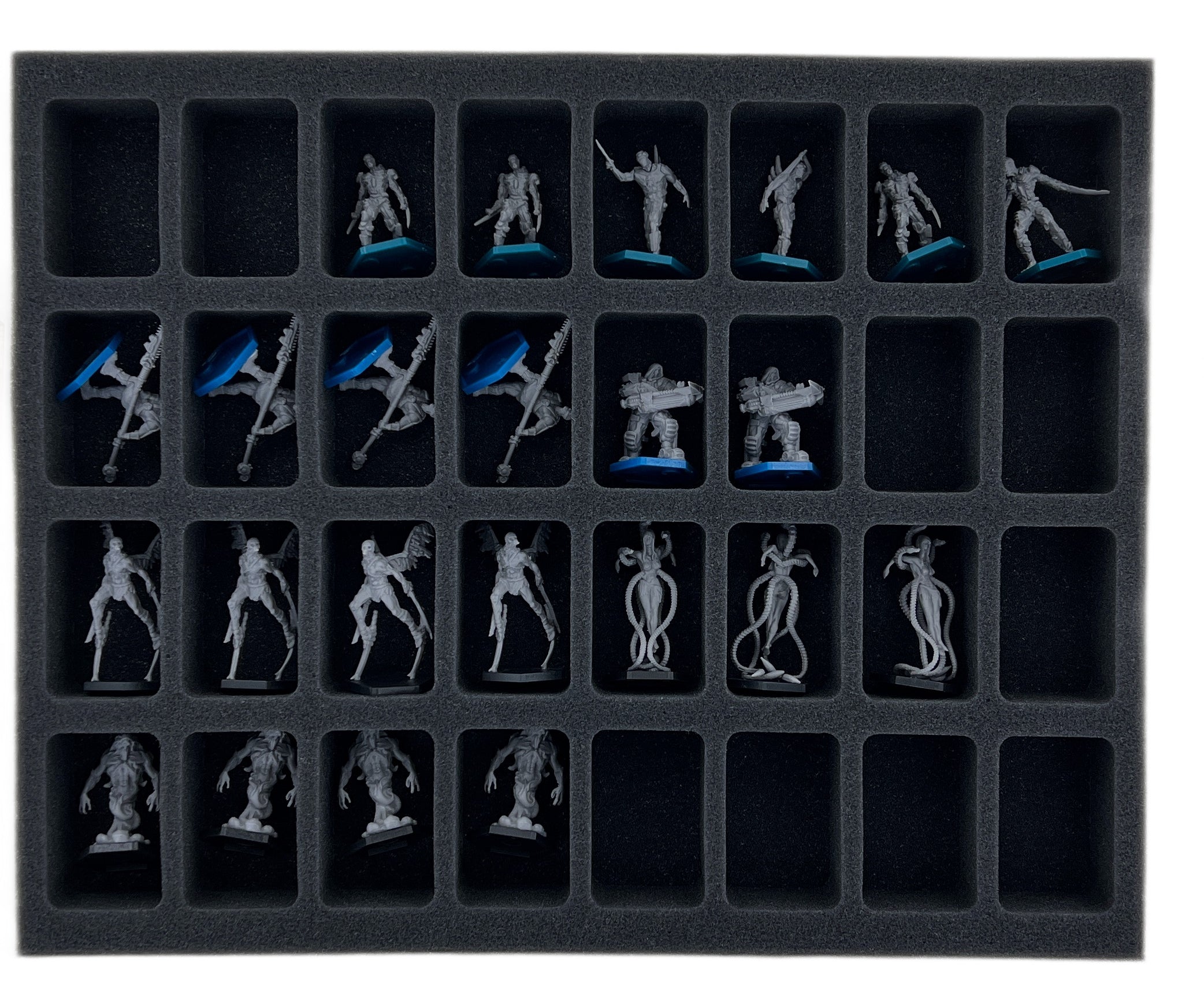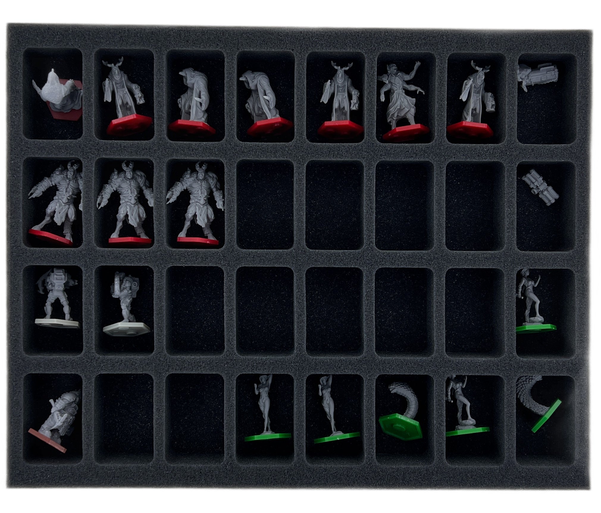 - 1 foam tray with 32 compartments for standard-sized Miniatures like Master of Elements, Dark Scholar, Bloodsmith, Enkindled, Wyrm, Tree Maid, Storm Bringer + Artifact Miniatures (FSMEDS040BO)