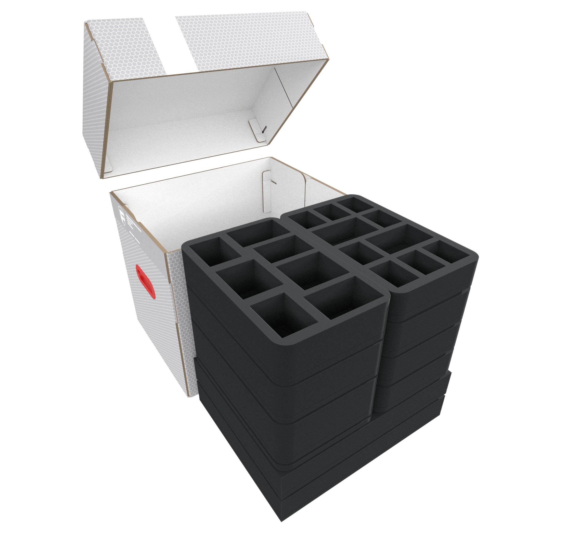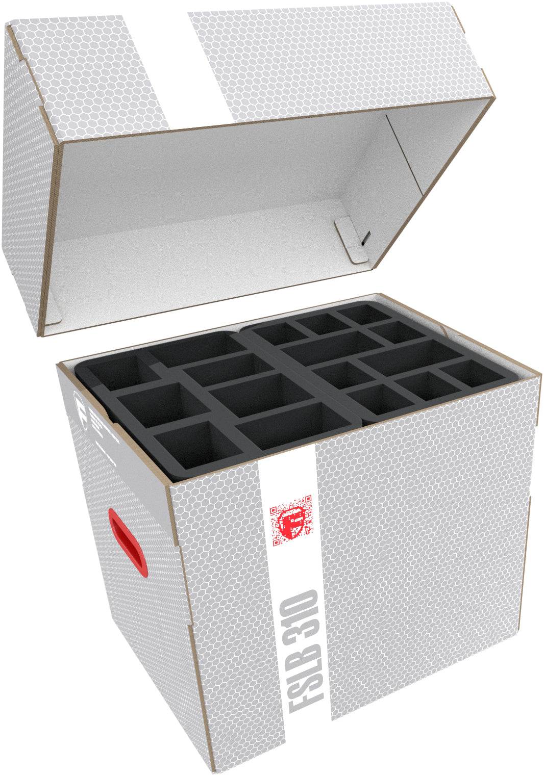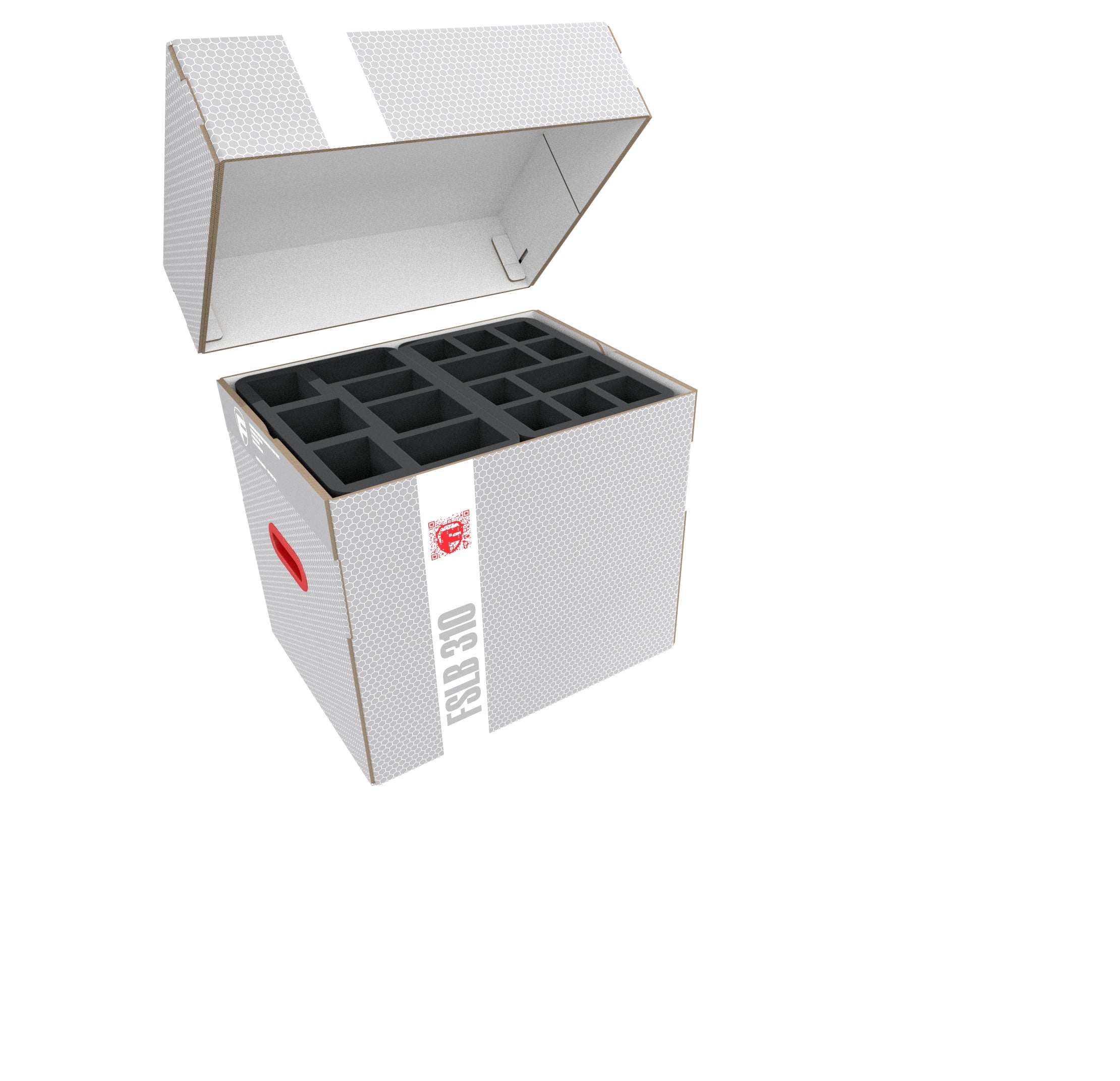 The Storage Box FSLB310 is made of coated, corrugated cardboard. This makes it not only pleasantly light but also particularly tear-resistant and stable. With the matching foam trays, miniatures and game material can be stored safely and dust-protected and can also be transported effortlessly with the plastic carrying handle. To make it easier to store and remove the foam mats, one side of the box can be opened completely. The trays are either inserted from above or simply slid into the box from the side.