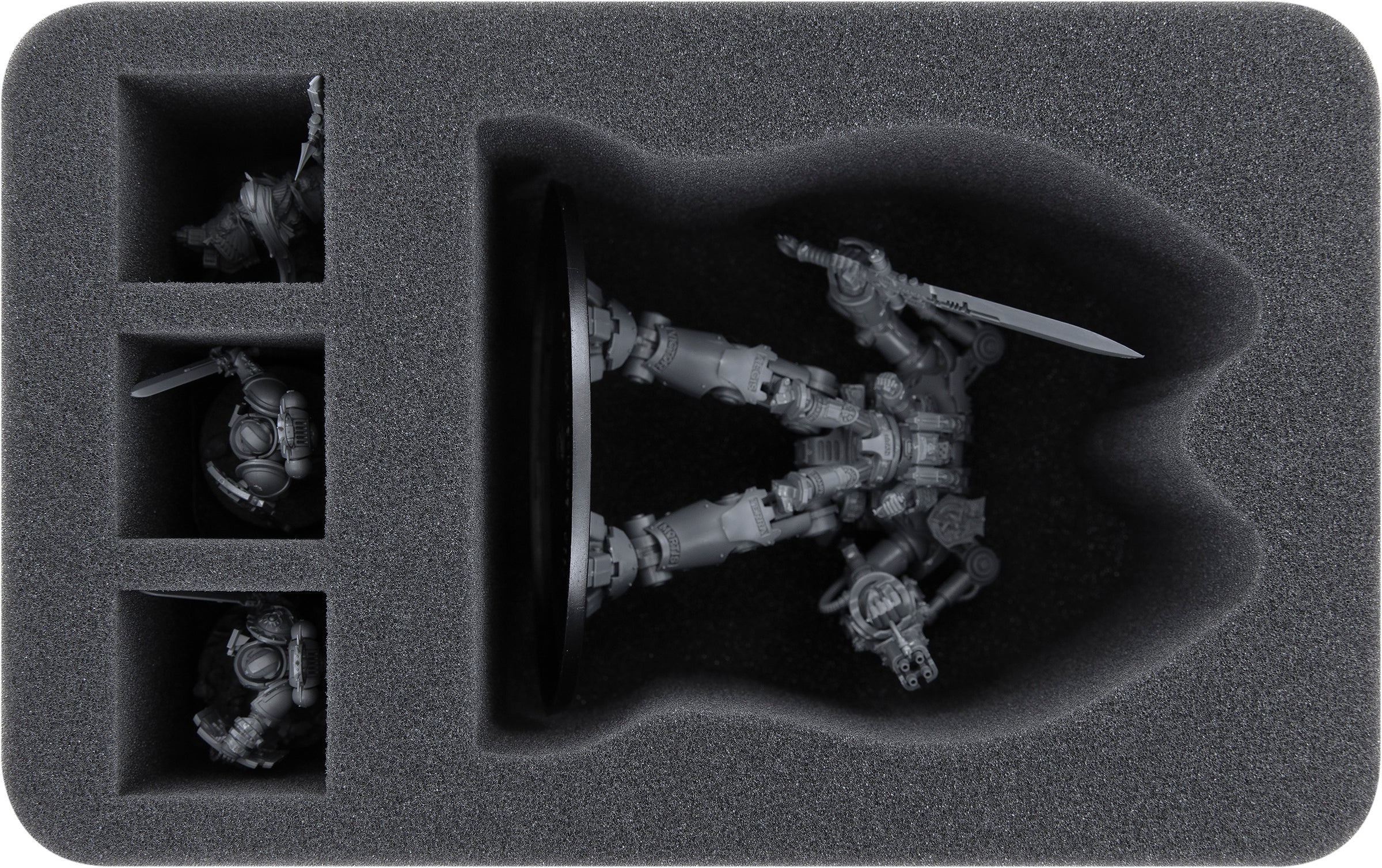 This Half-Size foam tray features a large compartment that can accommodate a Nemesis Dreadknight in a lying position. No matter how you build your Nemesis Knight, with a Nemesis Daemon hammer or Nemesis greatsword, gatling psilencer, or heavy incinerator, the Knight will fit in the generously sized compartment in all build variants.