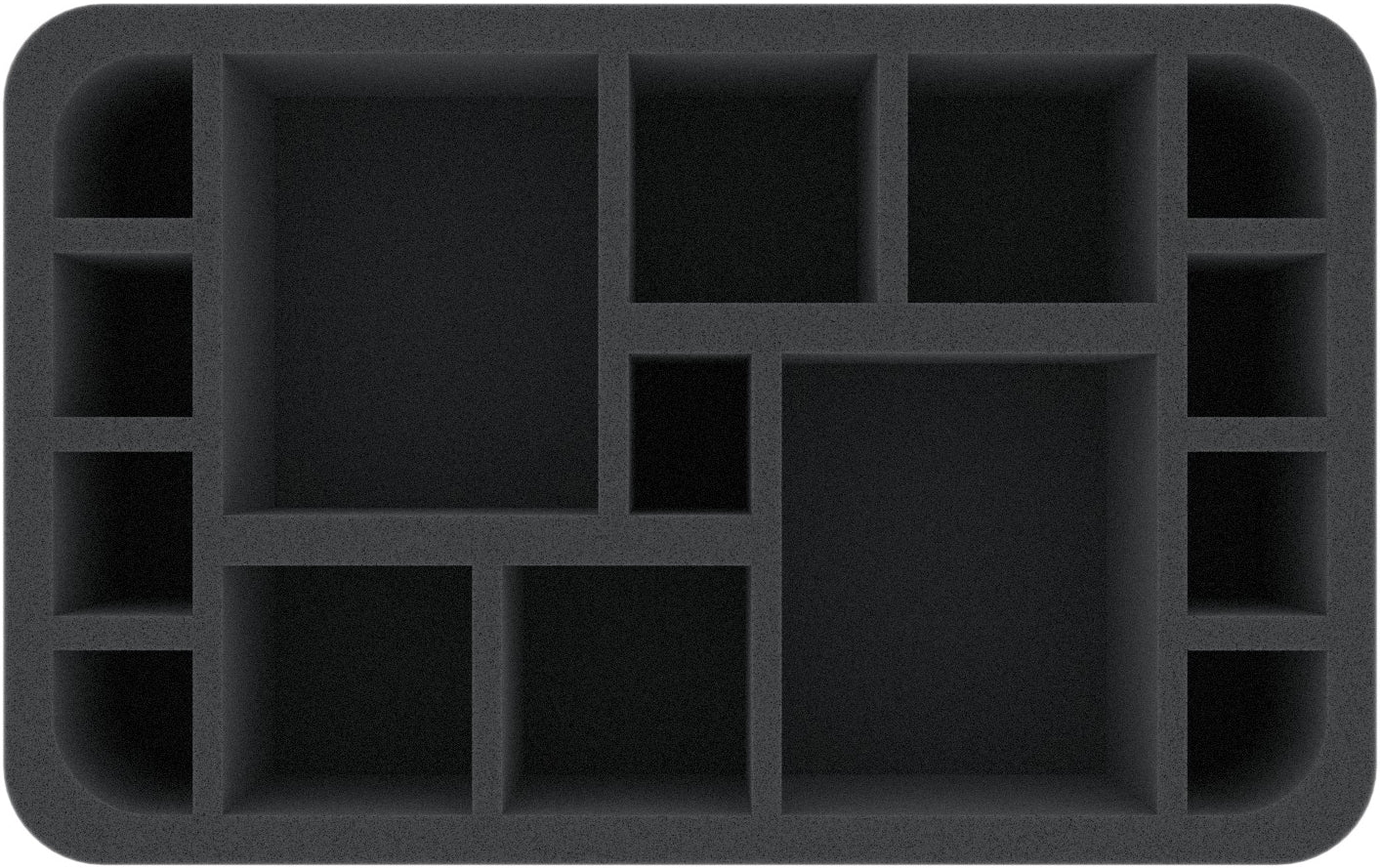 With this Half-Size insert, up to 15 Star Wars: Legion miniatures get a safe shelter. The insert offers 8 compartments for standard infantry (e.g. B1 Battle Droids, troopers), 4 compartments for medium-sized miniatures (e.g. Droidekas), 2 compartments for large figures, plus one small compartment in the middle for accessories, such as dice and tokens.