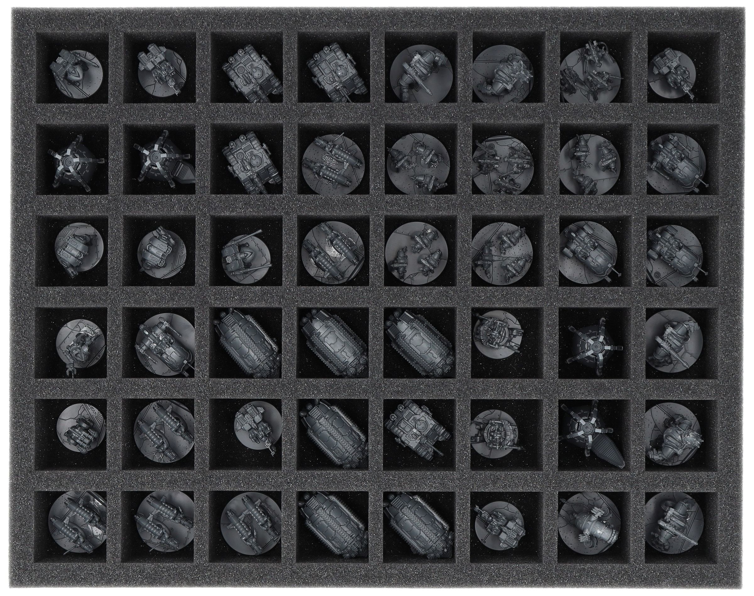 On this Feldherr foam tray you have space for up to 48 miniatures of your army. The insert is especially suitable for storing the Vultarax Stratos-Automata, Arlatax Battle-Automata, Domitar Battle-Automata, Vorax Battle-Automata, Castellax Battle-Automata, Thanatar Siege-Automata Cohort, Drop Pods and similar sized models.