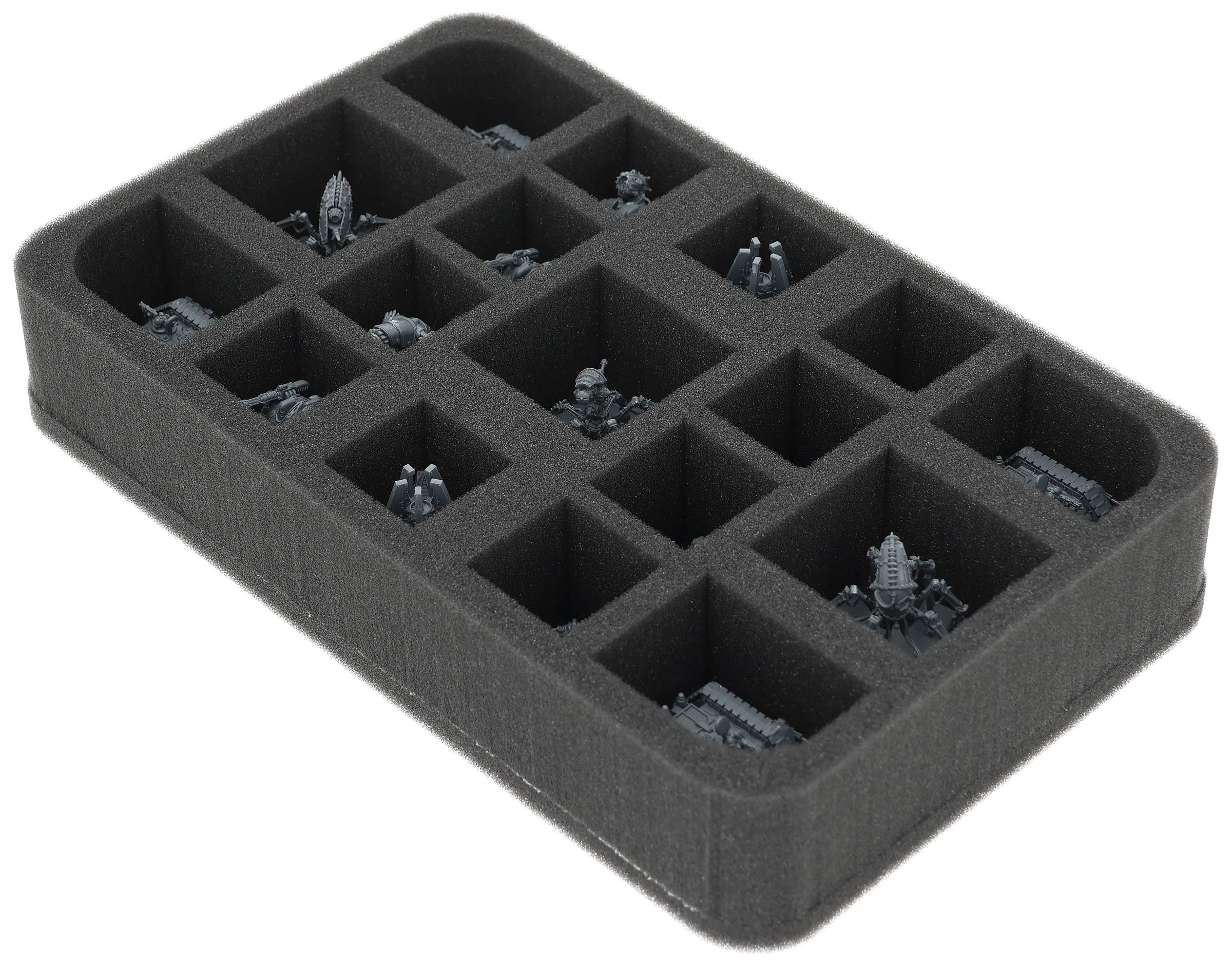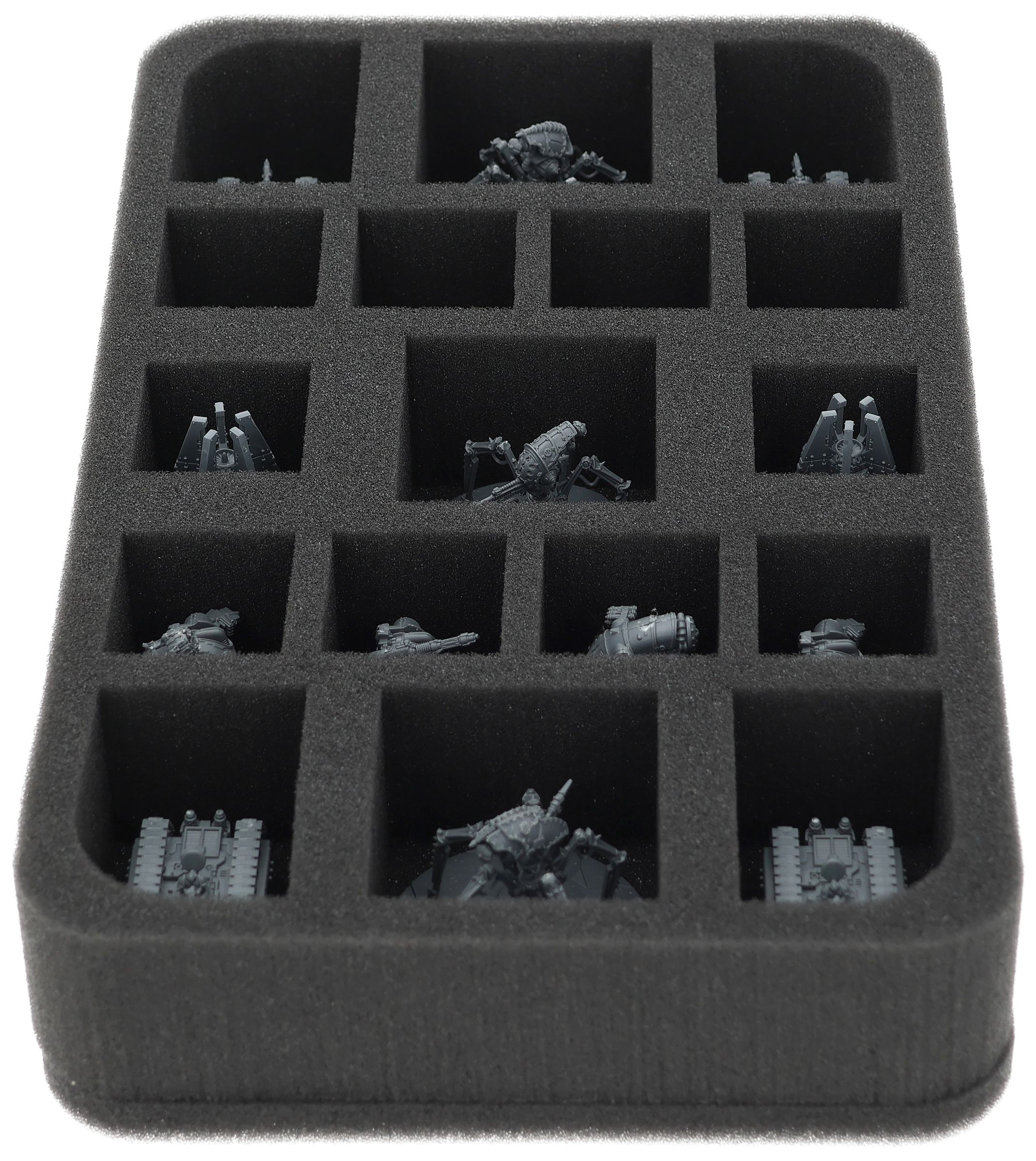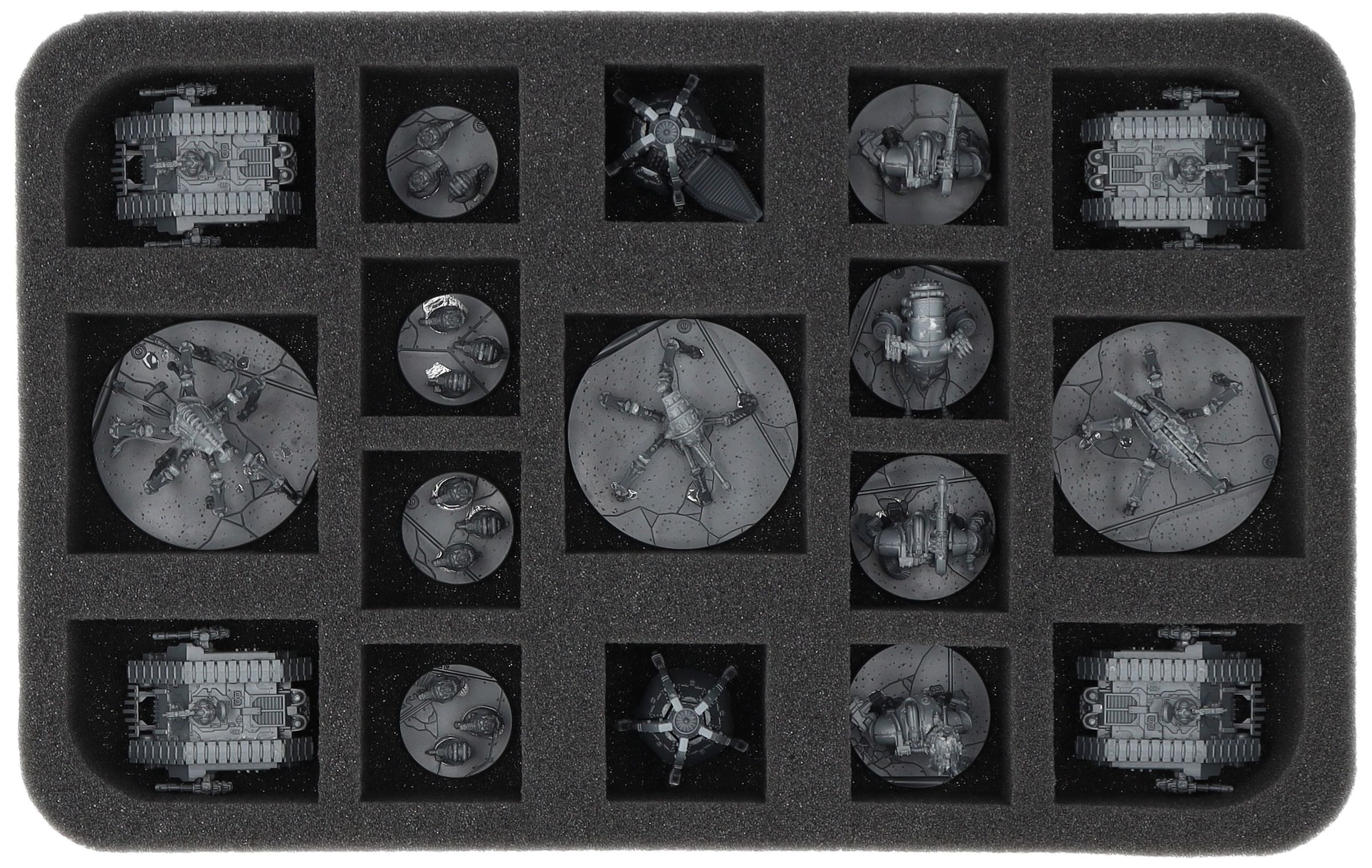 On this Feldherr foam tray you have space for up to 17 miniatures of your army. The insert is especially suitable for storing the Stalker Constructs, Errax 'Butcher' Assault Stalker Cohort, Tenebrax 'Archer' Battle Stalker Cohort, Scintillax 'Cyclops' Noospheric Stalker Network and similar sized models.
