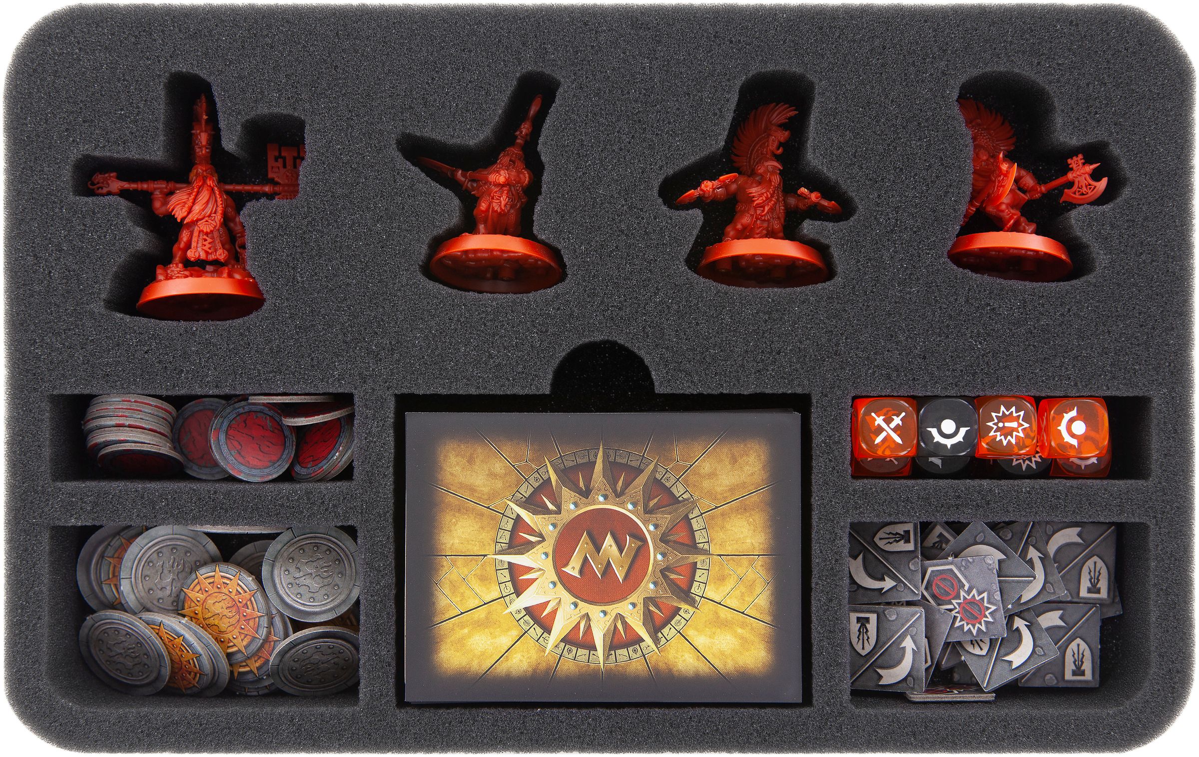 With the warband of The Chosen Axes for Warhammer Underworlds: Shadespire, your collection is expanded by four more miniatures, a 60-card deck and 6 dice. So that Fjul-Grimnir and his men are all safely and orderly stored, we have designed this custom foam tray for you.