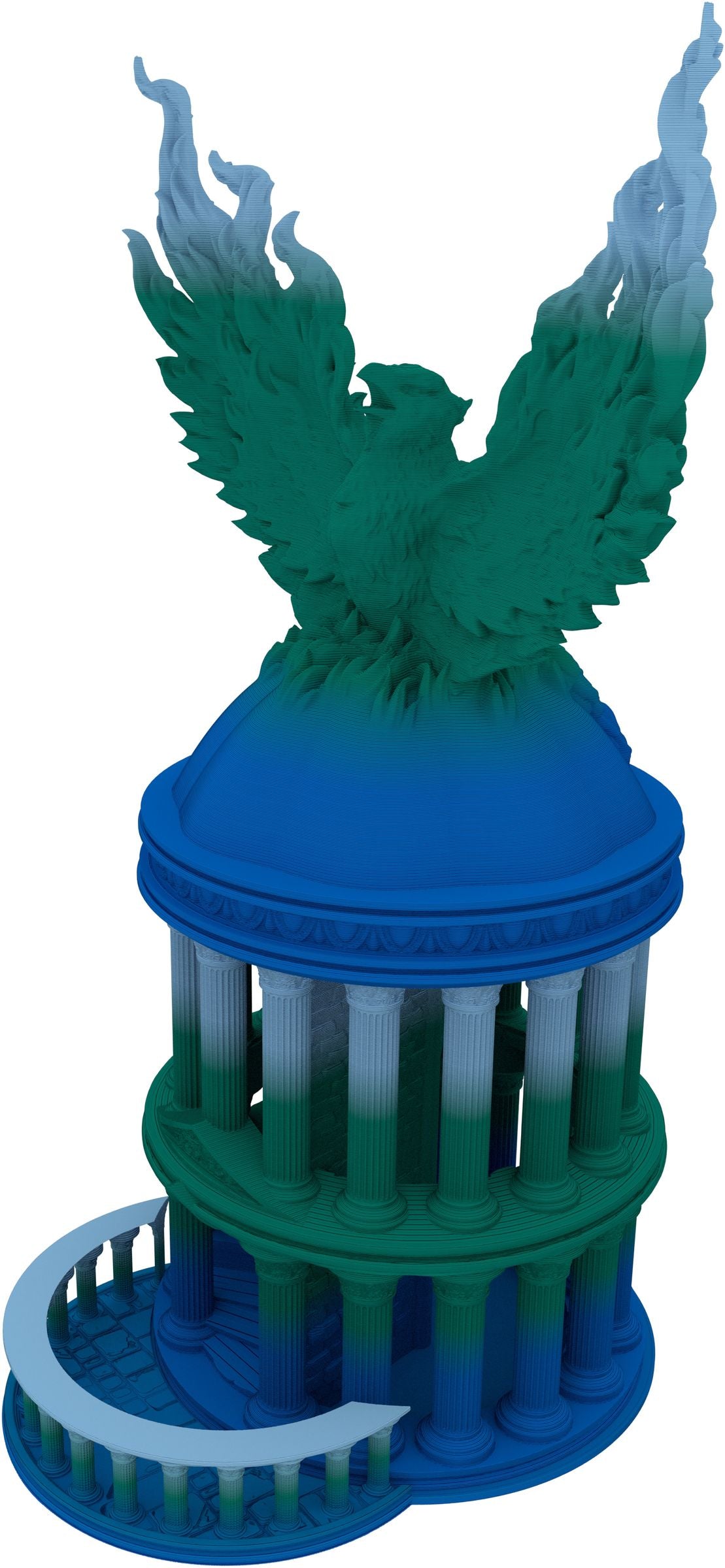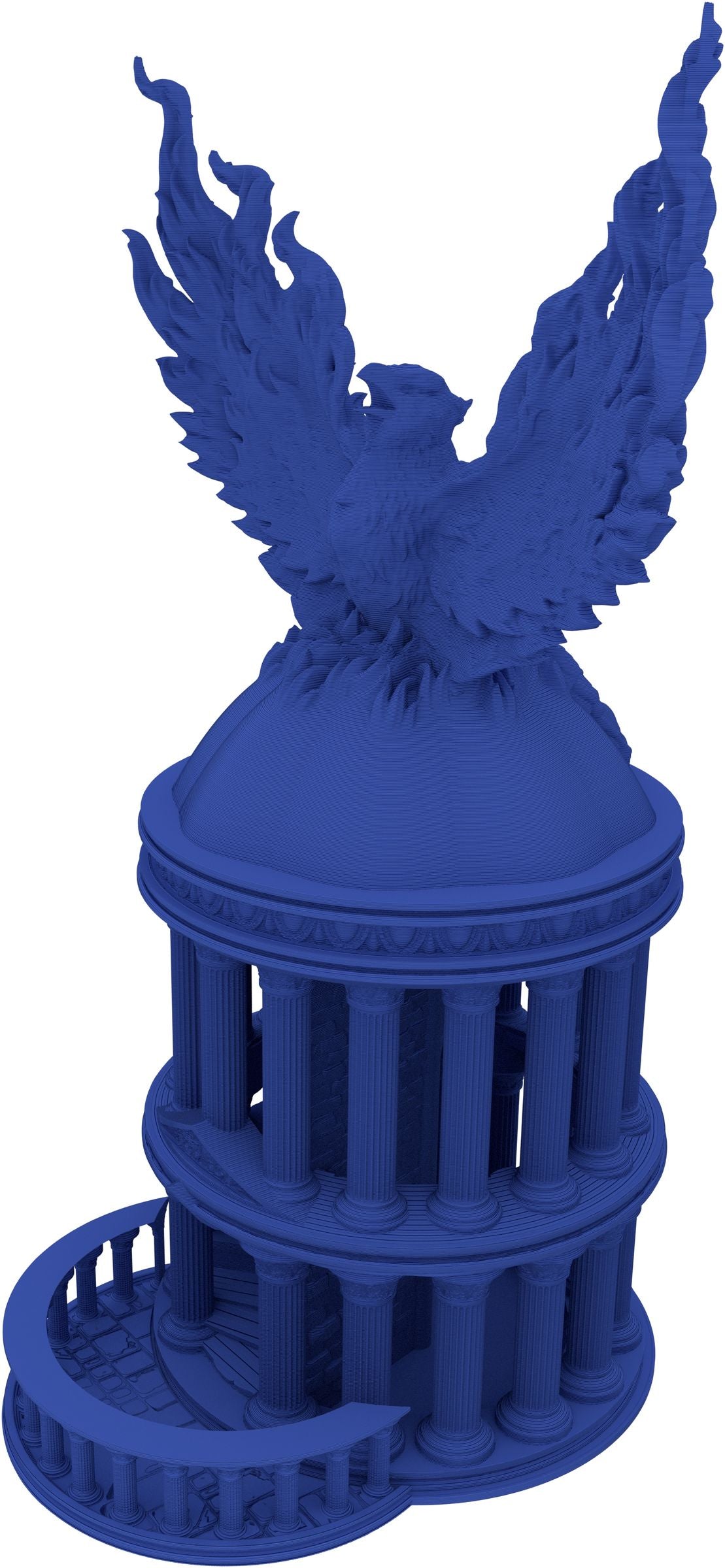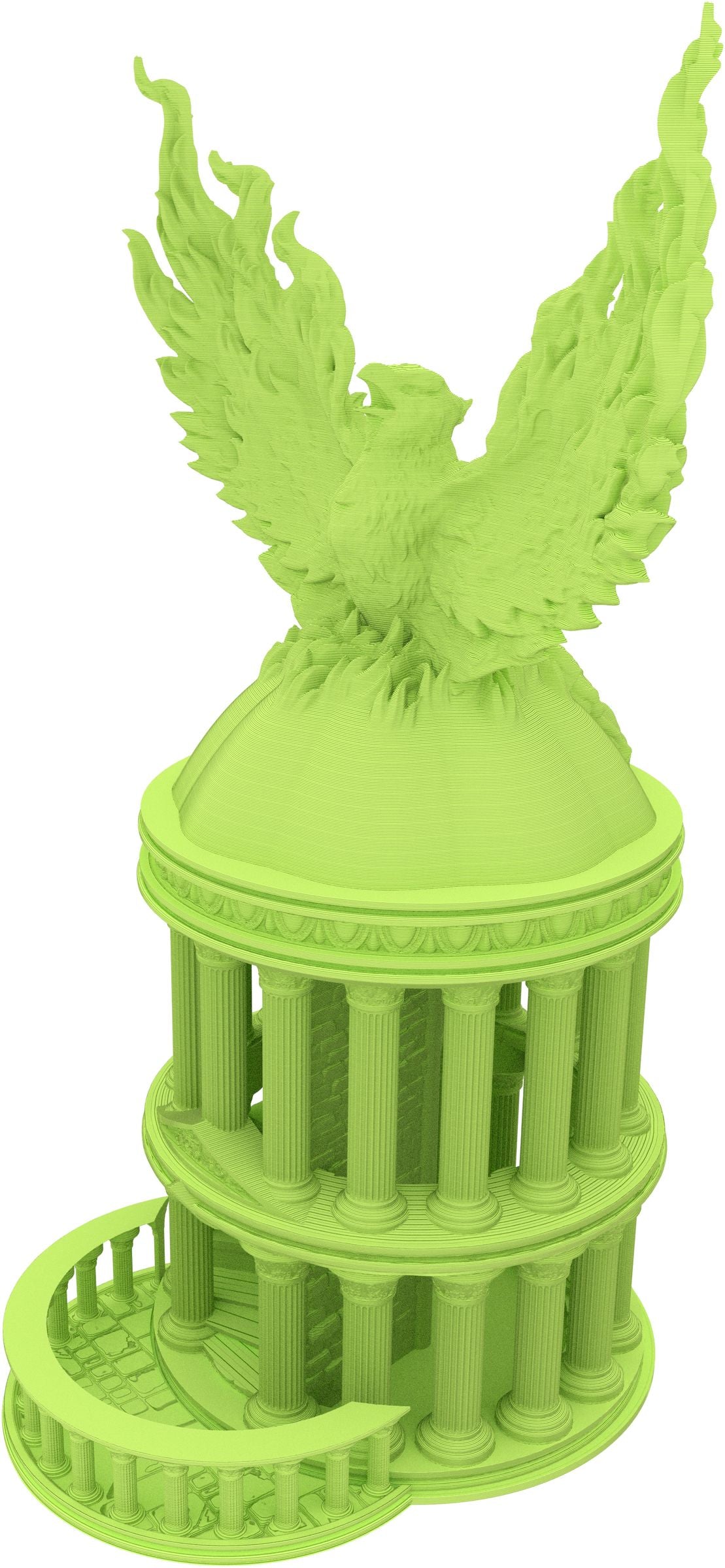 3D printed - detailed dice tower, with removable roof and exchangeable dice tray. The Dice Tower can also be used as a terrain part for your miniatures game or as a center piece for your next DnD session.