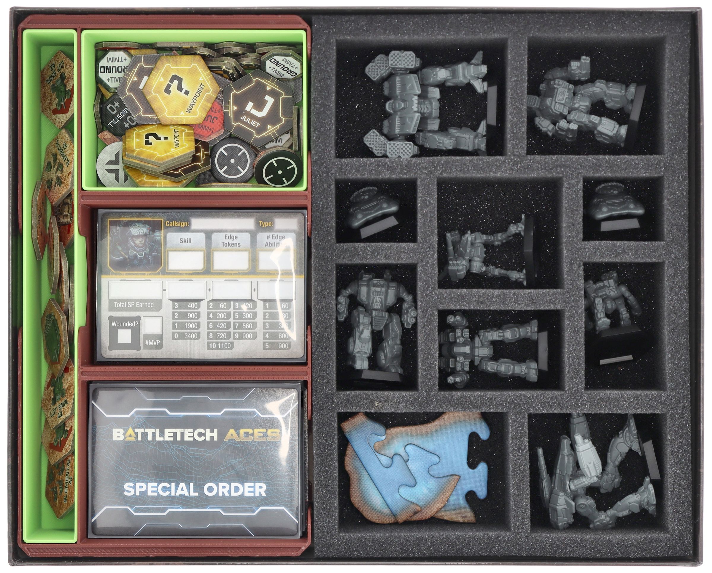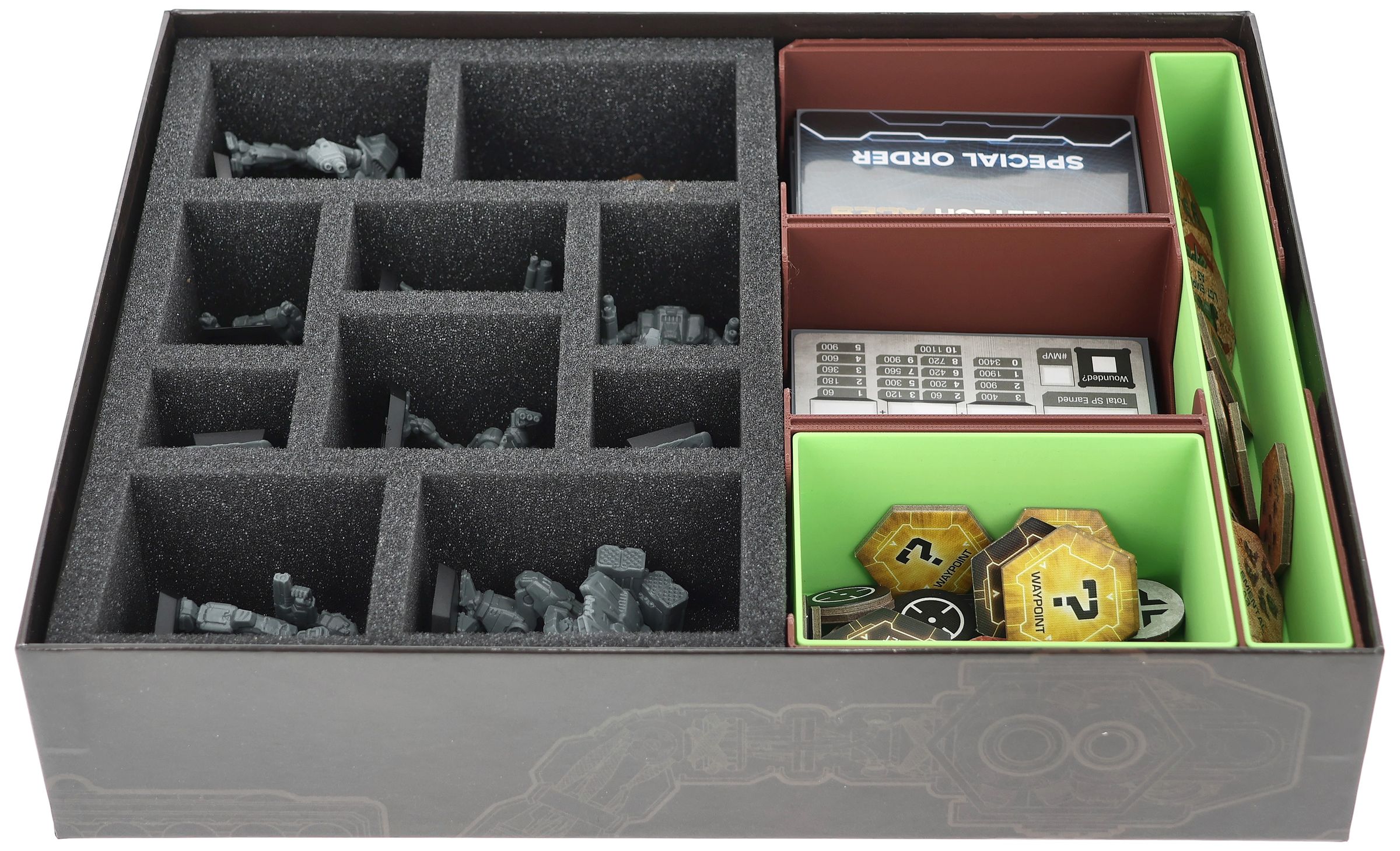 - The set fits perfectly into the original BattleTech: Aces - Scouring Sands core game box (total dimensions of the insert: 285 mm x 230 mm x 55 mm).