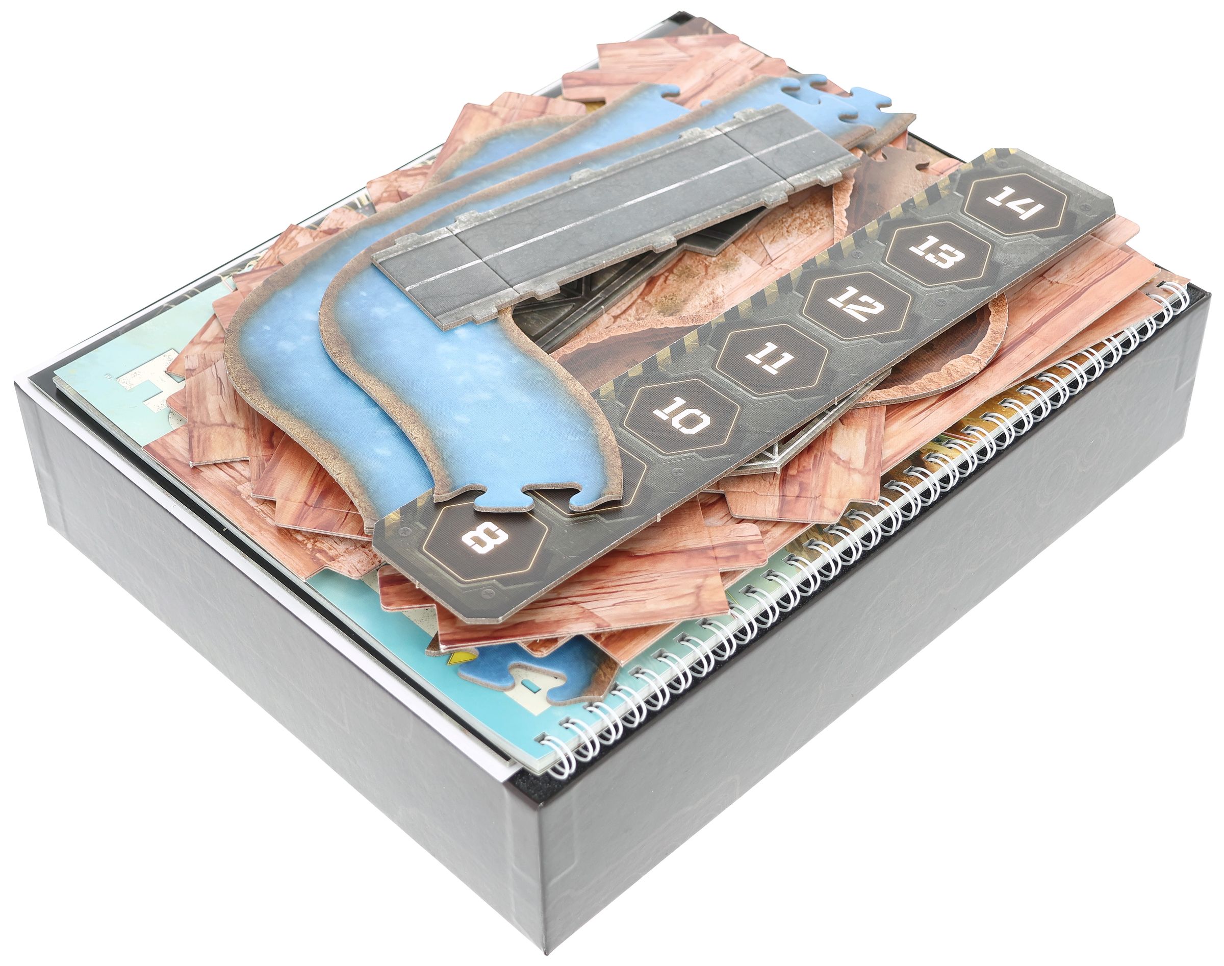 - Terrain tiles and the rulebook are placed together on top of the insert.