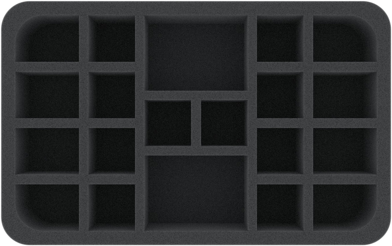 One Half-Size foam tray with a total of 20 compartments takes care of the well-being of your heroes. 18 compartments provide safe space for the hero miniatures. From Kroghan to Skeld to Volkor, every figure gets the right compartment. Thanks to the custom-fit cut, the miniatures stay in their softly padded place even during transport. With this, the painted models are also safe from abrasion and flaking colors.